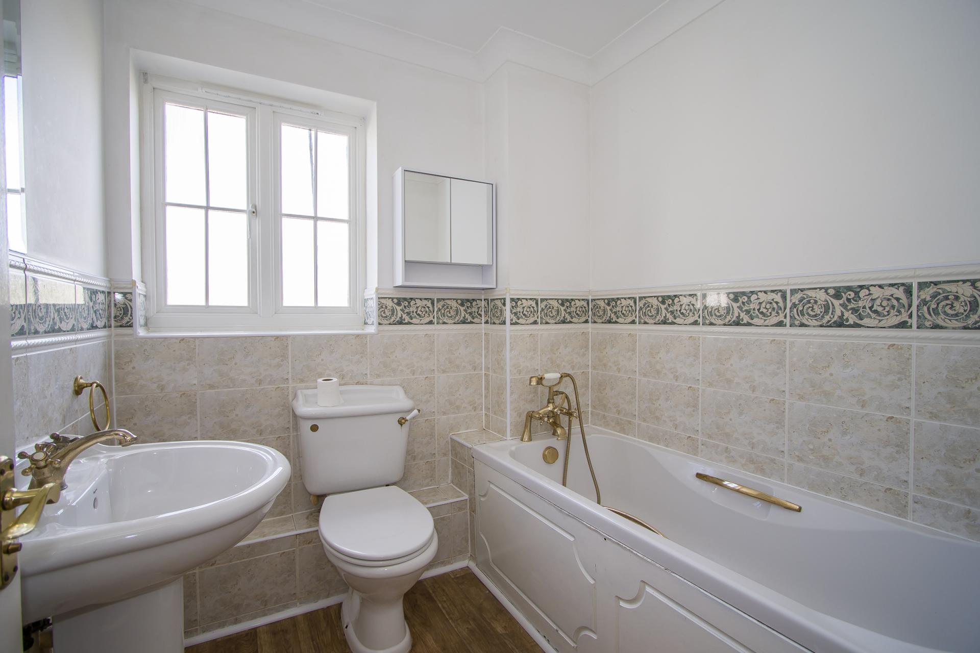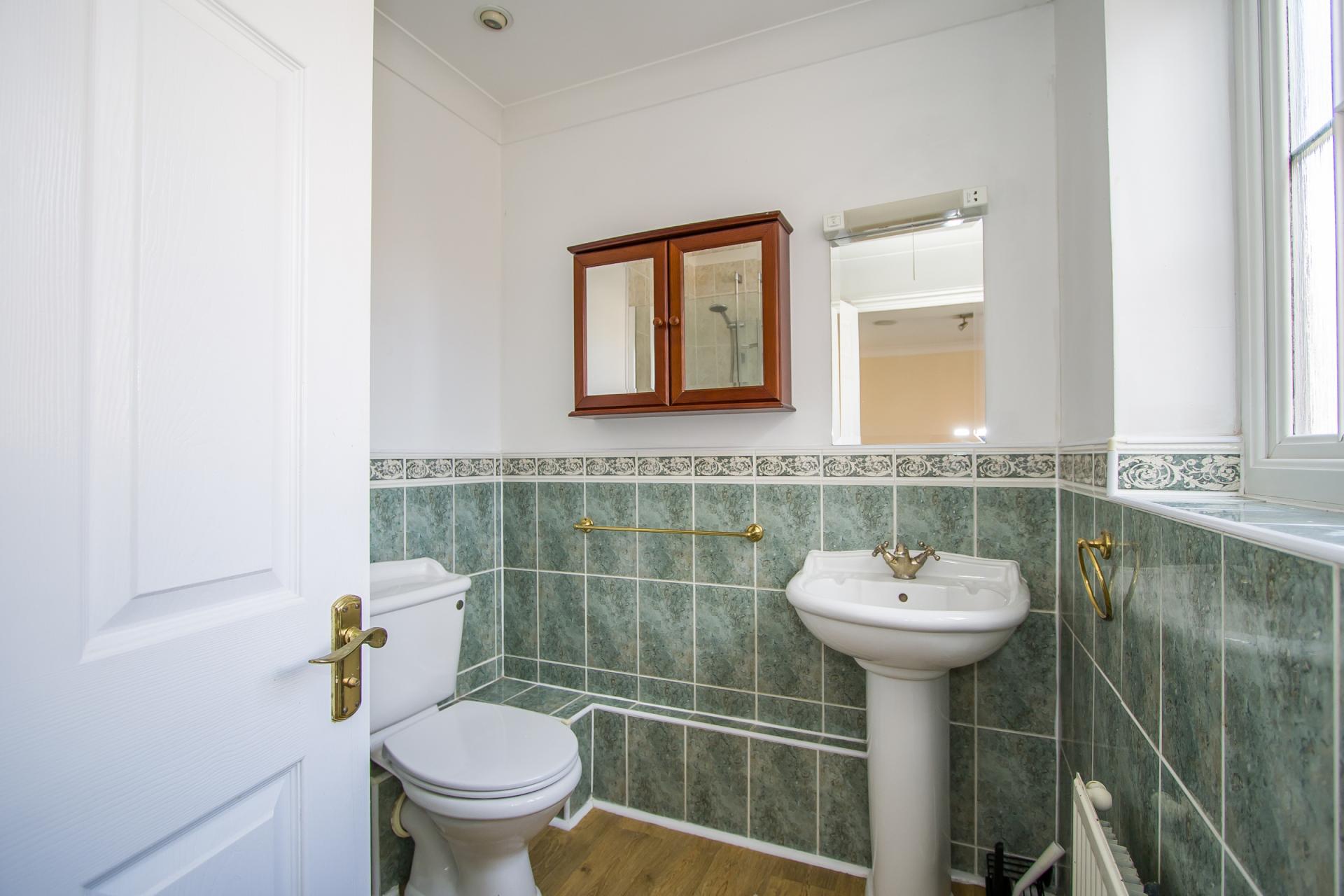 Wood effect vinyl flooring. Suite comprising a shower cubicle with mixer shower, a WC and a pedestal sink. Part tiled walls. Central heating radiator. uPVC double glazed window to front. Coved ceiling. Extractor fan. Mirror with electric light and shaver point. Bathroom cabinet.