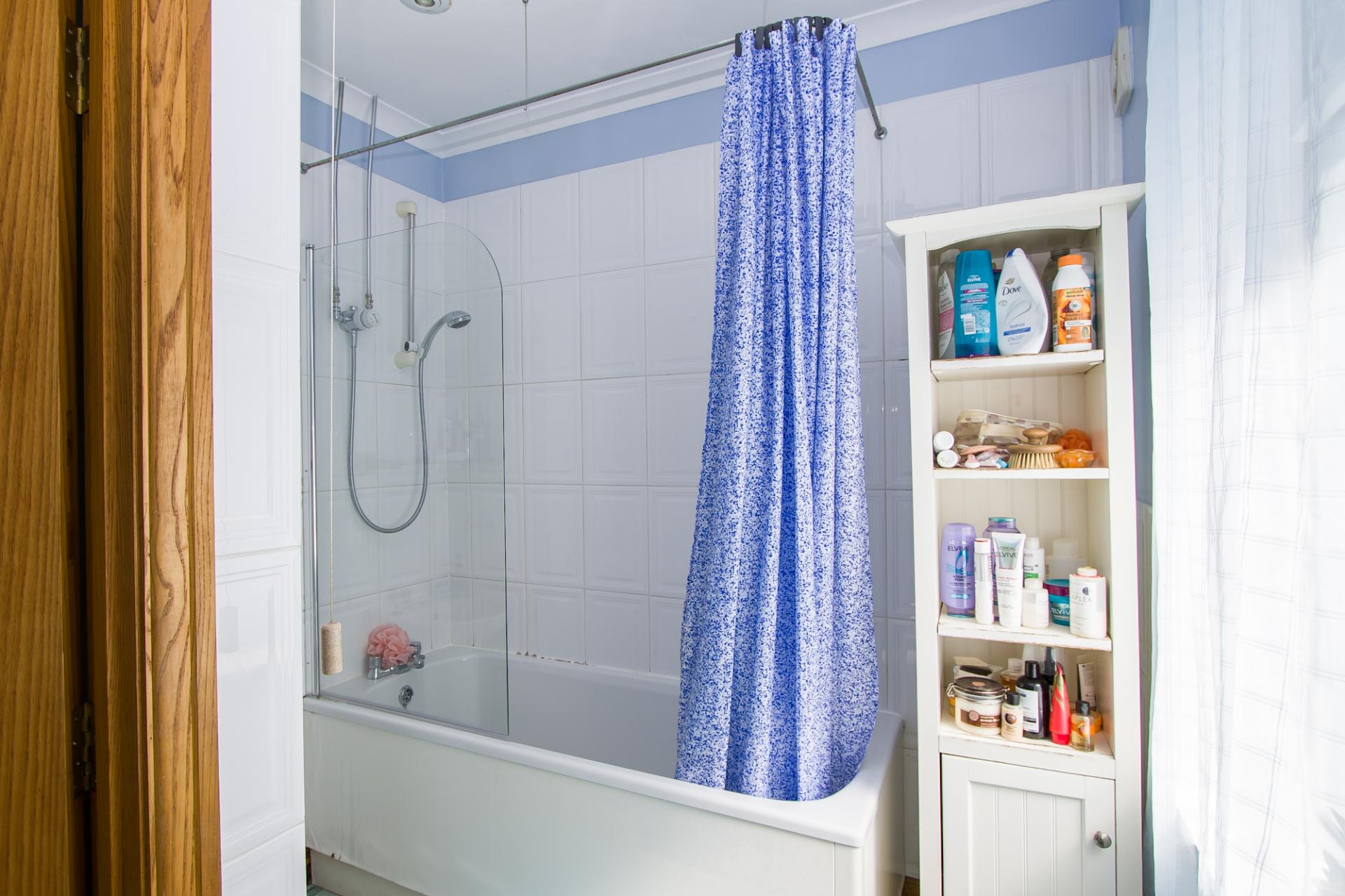 Two uPVC double glazed windows to the front. Vinyl floor and part tiled walls. Suite comprising a panelled bath with mixer shower and glass screen, a WC and a sink. Heated towel rail. Recessed lights. Coved ceiling.