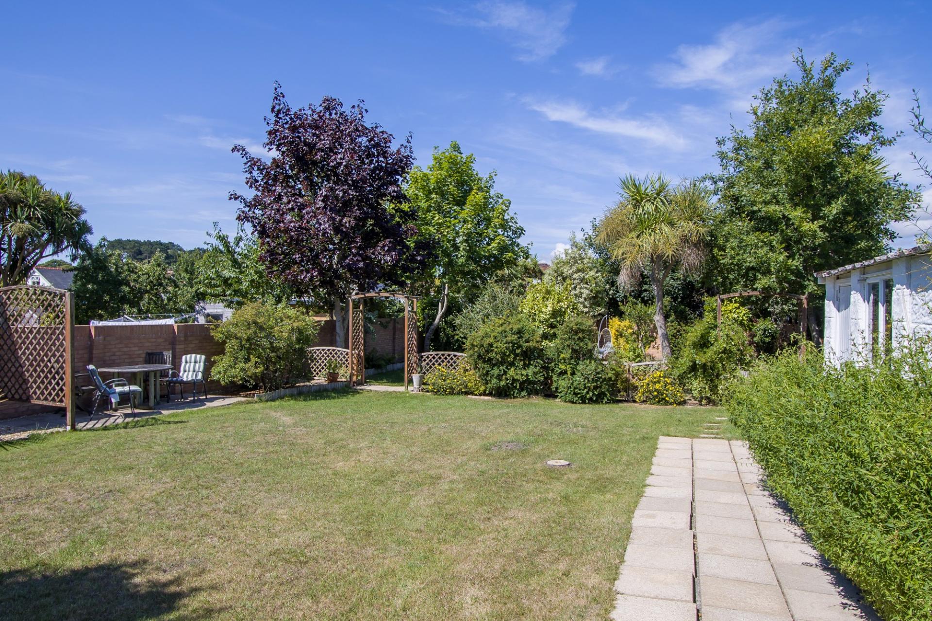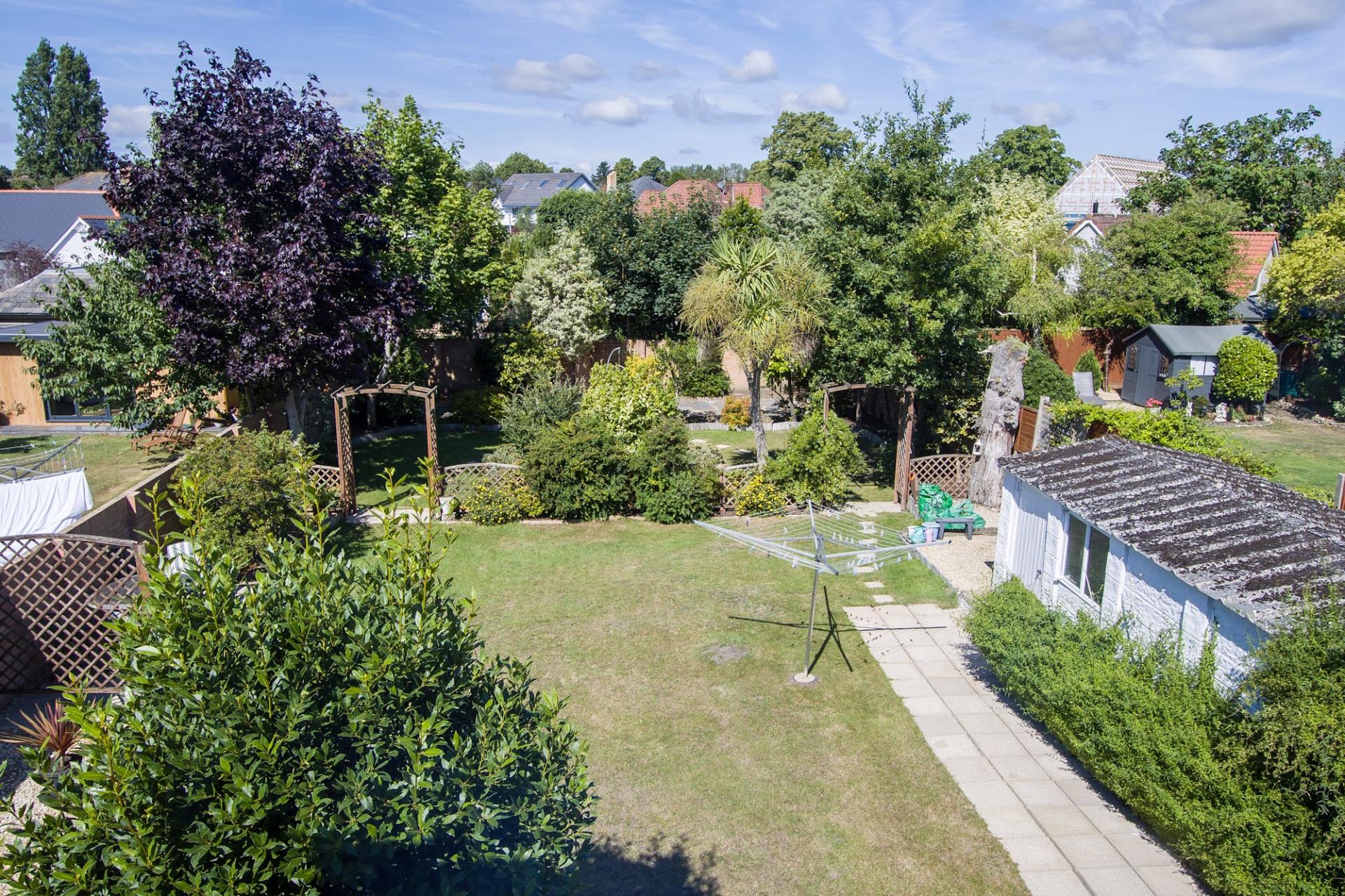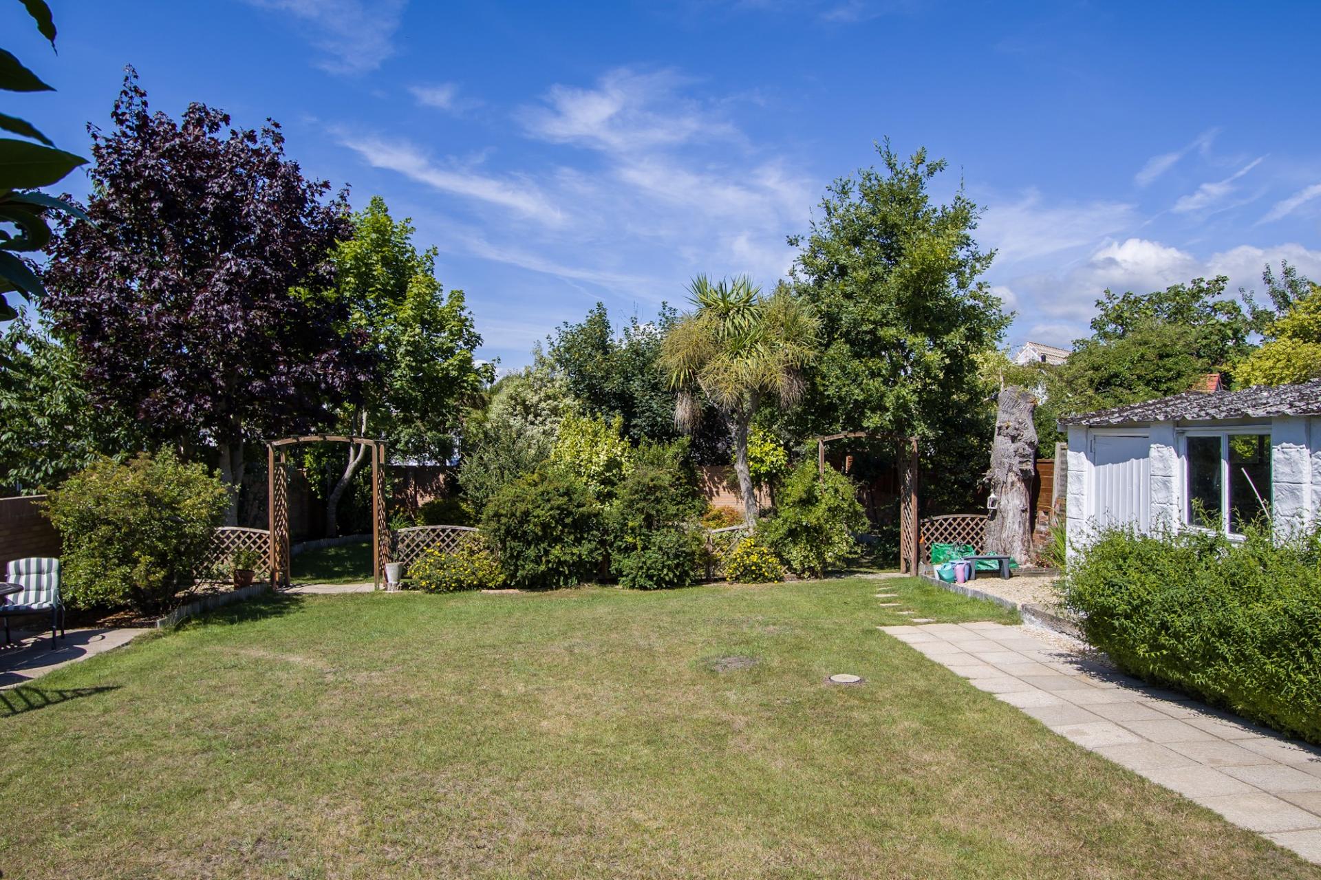 An excellent rear garden, very private, mature and with a sunny westerly aspect that ensures sun from mid-morning through to the evening. Predominantly laid to lawn, the garden is currently in two sections with a main lawn and patio initially. This space has numerous sitting areas along with access to the garage and driveway. The bottom section is partly separate with hedge plants and provide another garden full of places to sit, with lawn, patio and area laid to stone chippings. The bottom garden has some attractive mature trees and can provide a bit more shade.