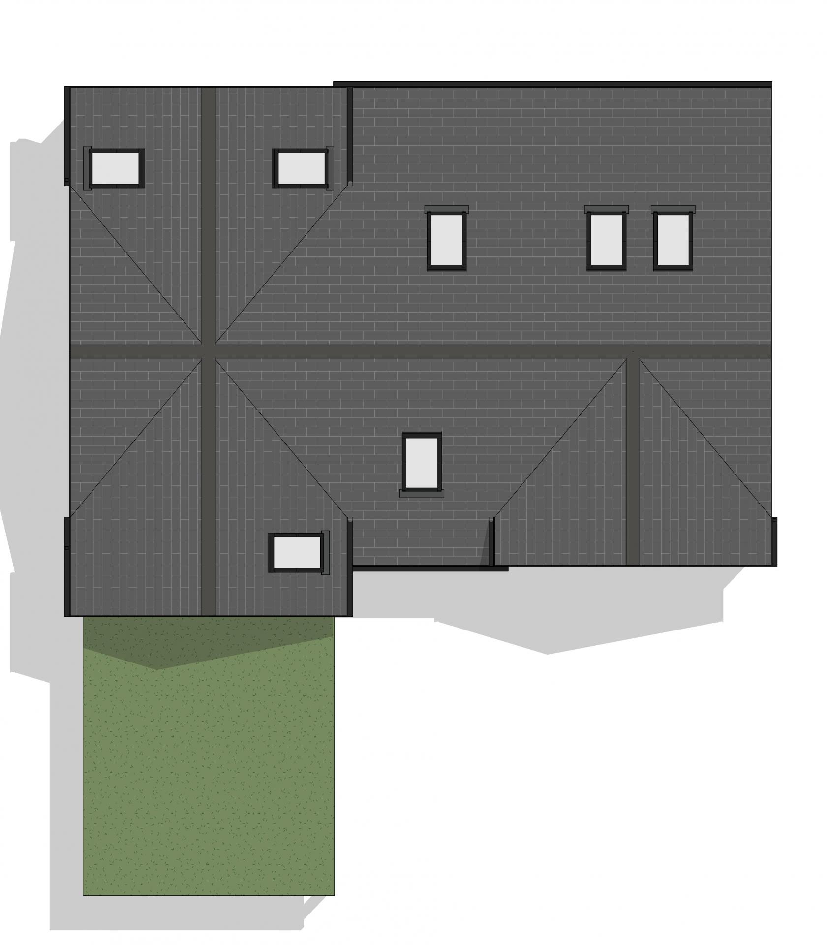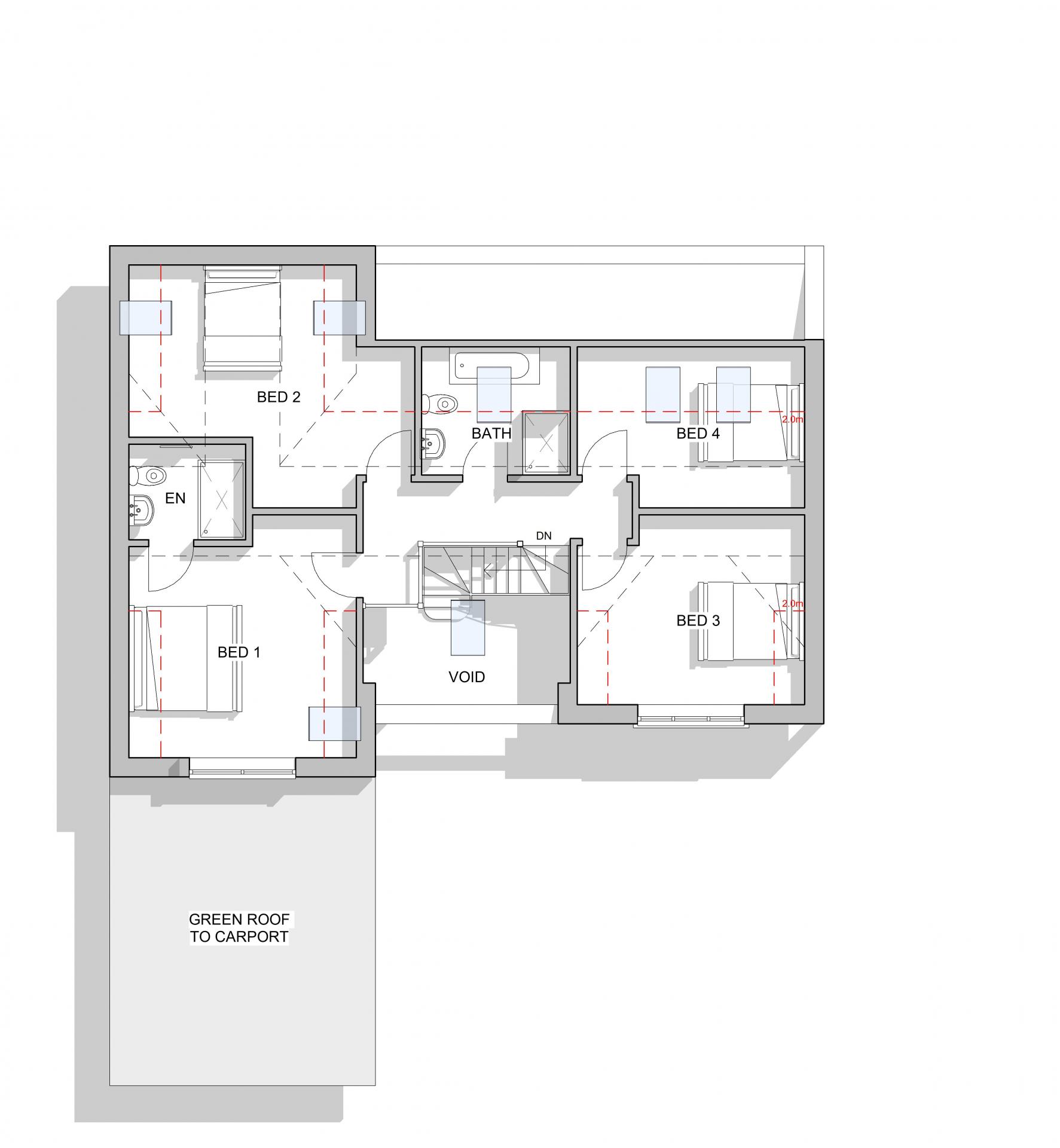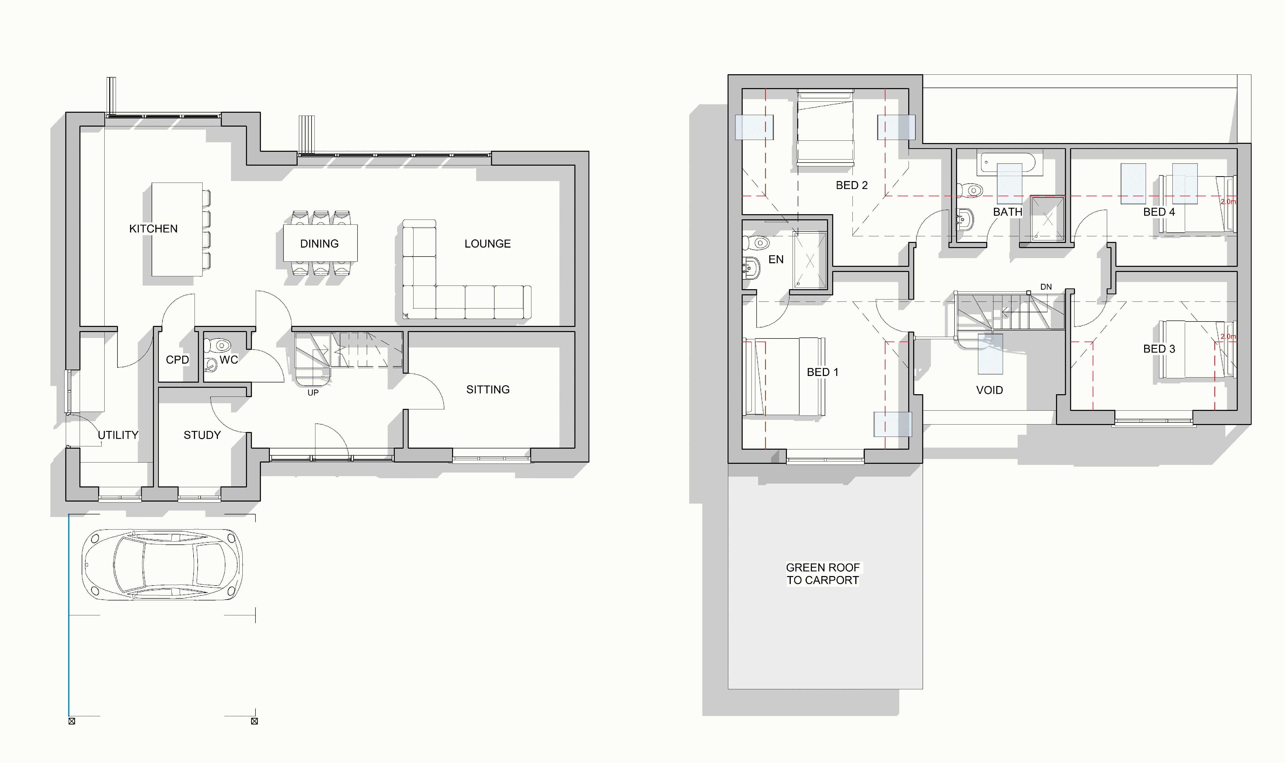 - Shared driveway to parking area and green-roofed car-port, rear garden.