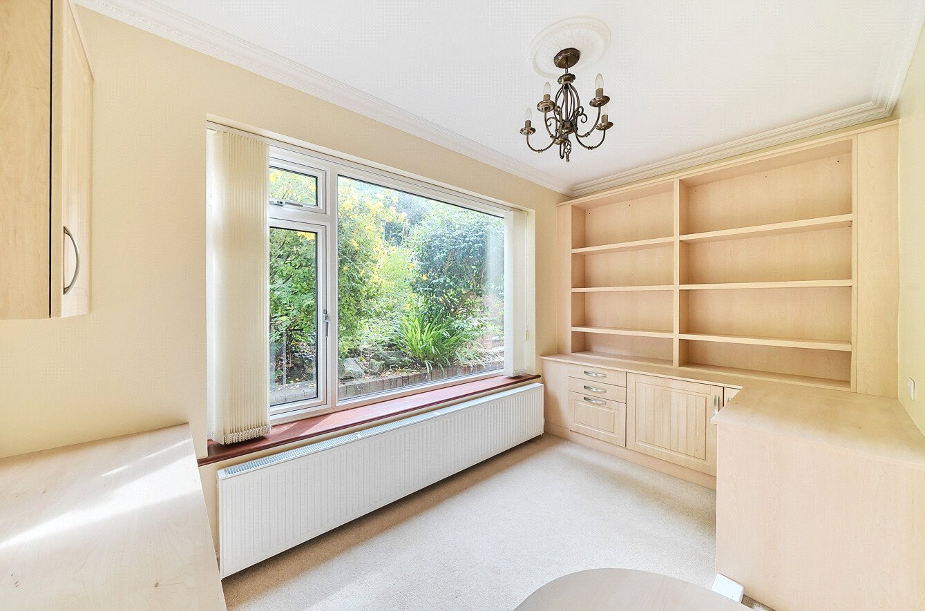 The accommodation includes an entrance porch with a glazed inner door opening into the hall, where stairs rise to the first floor. There is a ground floor cloakroom, and the spacious living room features double glazed doors opening onto the front garden, a tiled fireplace, and a door through to the office - ideal for those working from home - with a range of fitted office furniture. There is a separate dining room, while the kitchen is equipped with a range of units and integrated appliances, including a fridge, freezer, dishwasher, Neff electric oven and grill, gas hob, and extractor. A stainless steel sink is set into the work surfaces, and there is also a breakfast bar. The original garage has been converted into a large utility room, although the garage's up-and-over door remains in place.