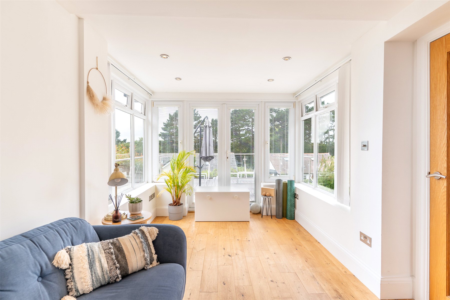 The front of the property boasts two glass-fronted balustrades to fully utilise the Southerly aspect and Westerly sunsets. There is a double garage and ample parking on the expansive driveway, complete with an EV charging point and bordered by an attractive, landscaped and tiered front garden.
