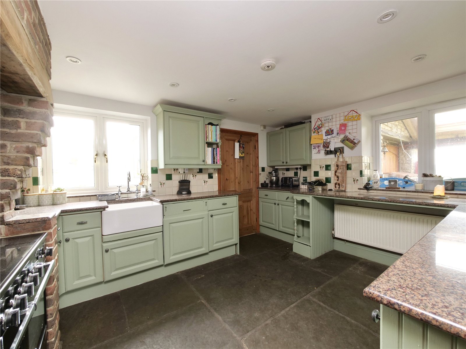 A welcoming stone porch leads into the dining room, a bright and characterful space with stripped wood floors, exposed beams, and a fireplace ready for a wood-burning stove. The stained glass door invites you into the farmhouse-style kitchen, where flagstone floors, a Belfast sink, and a large electric range cooker in the brick inglenook create a charming yet practical workspace.