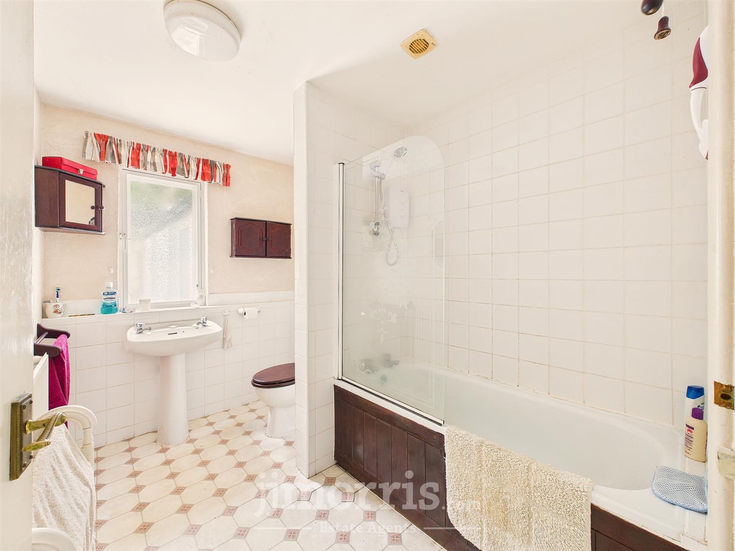 Shower Room - 3 piece white suite comprising of a panelled bath with Redring electric shower above, pedestal wash hand basin, low level flush WC. Central heating radiator, window to side, part tiled walls.