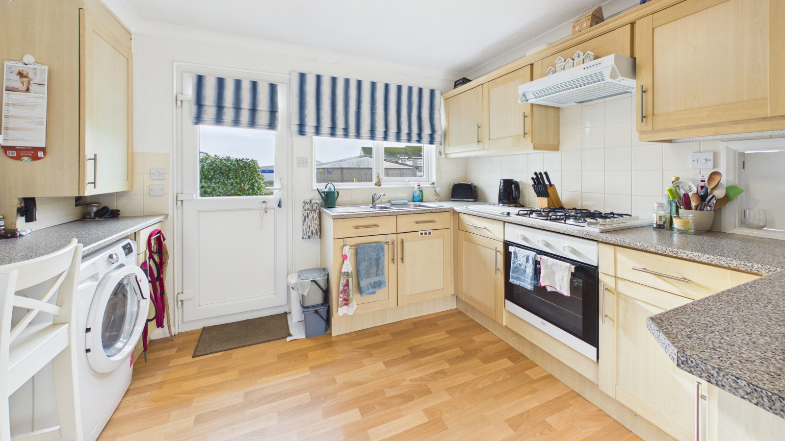 UPVC double glazed window and door to rear, range of base and wall units, worksurface and tiling over, electric cooker, gas hob, radiator, space for fridge, washing machine and tumble dryer, wall mounted combination boiler.