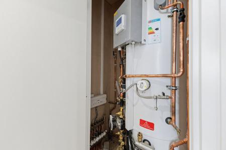 Underfloor heating throughout the ground floor provides year-round comfort, while an air source heat pump and solar panels ensure energy efficiency and environmentally conscious living.