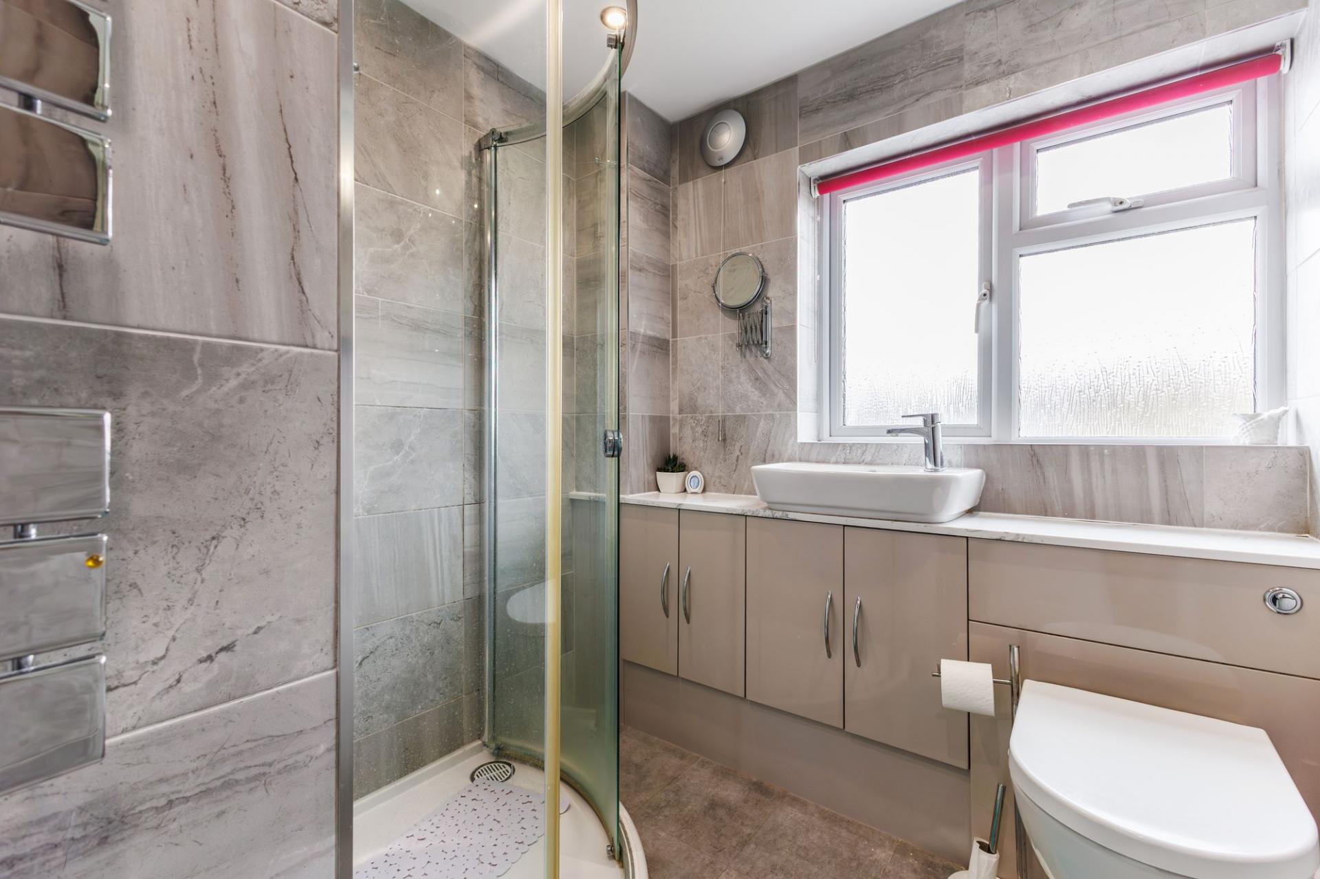Upstairs, the first-floor landing leads to three bedrooms and a shower room. The principal bedroom is well-proportioned with built-in storage, whilst bedroom two offers a comfortable double room and bedroom three provides an ideal single bedroom, nursery or home office.