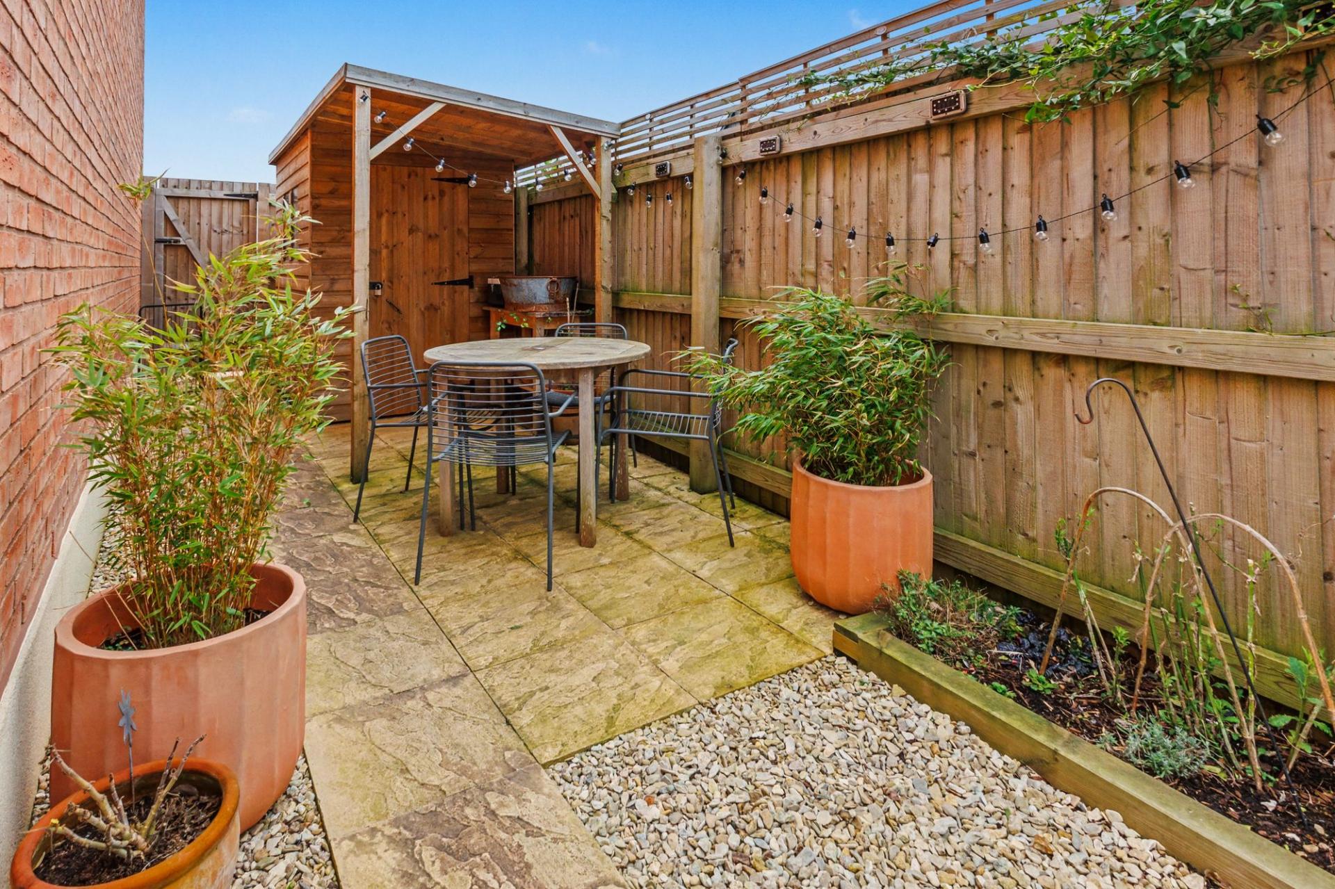 - Private, low-maintenance rear garden with patio and storage