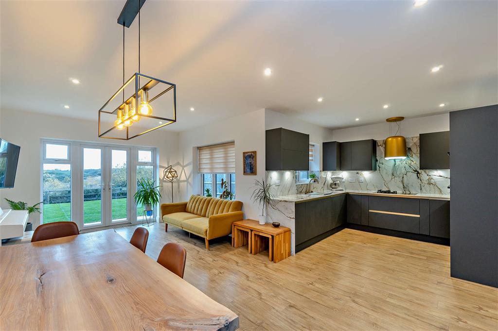 On the ground floor, the entrance hall leads to a convenient cloakroom and an integral garage. At the rear, the open-plan kitchen and living area creates a welcoming space for cooking, dining, and relaxing, with plenty of room for the whole family to enjoy, there is also access to the garden and fantastic views. The kitchen has also been re-fitted by the current owners to a very high standard with contemporary units.