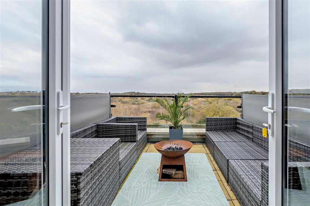 The first floor includes a separate sitting room with access onto the balcony which has space for seating and views over the nature reserve to the west, along with three well-proportioned bedrooms, and the family bathroom.