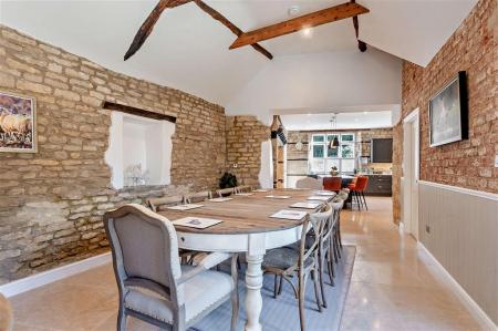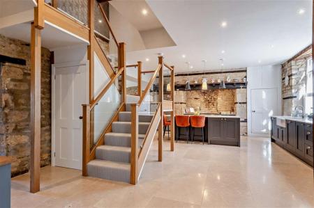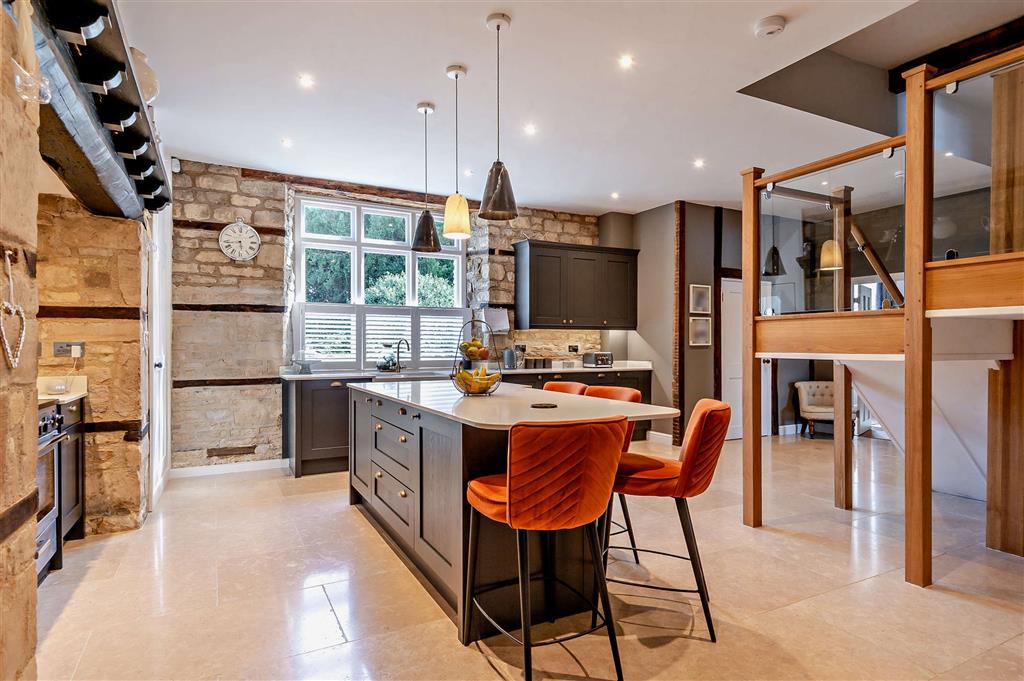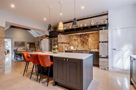 The island is a great entertaining spot with space for 4 bar stools as well as plenty of space for food preparation. On the left hand side of the chimney breast there is space for a large American fridge/freezer and to the right an original storage cupboard, great for use as a pantry. The floors are finished in limestone flooring, in keeping with the age of the building. The kitchen opens up to the dining room, currently housing a dining table and 10 chairs with the use of a utility room to the left hand side great for additional storage as well as space for the white goods with space for washing machine as well as tumble dryer.