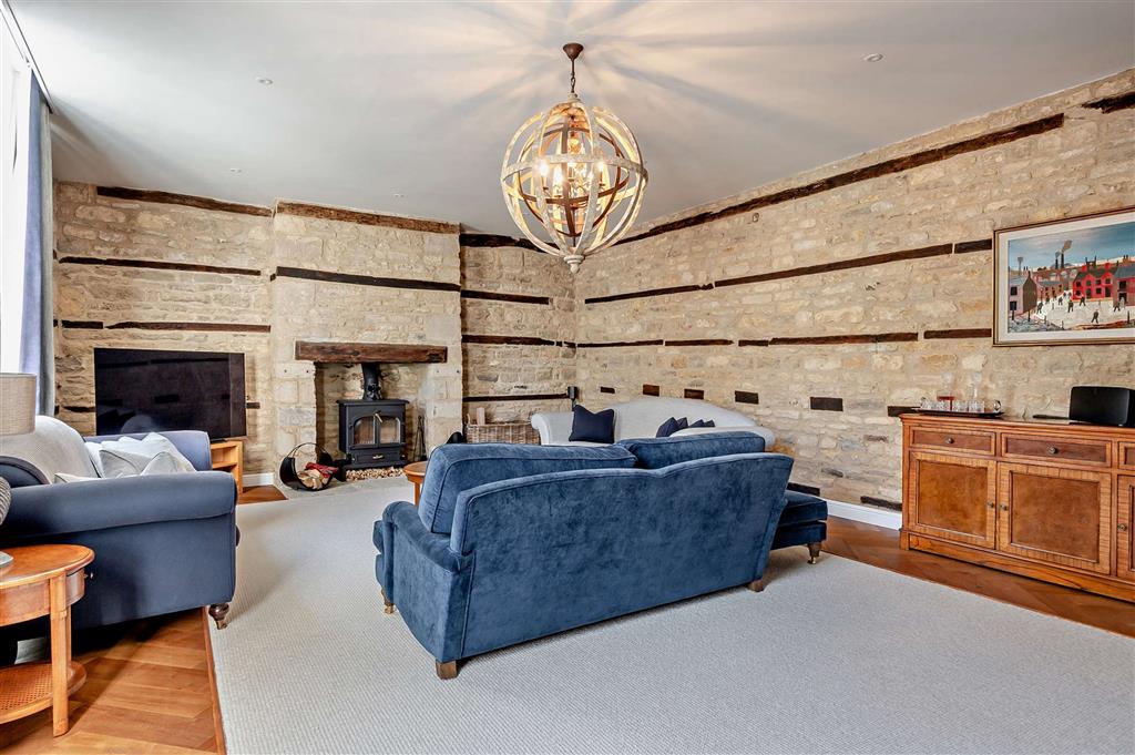 To the rear is a large TV room featuring bi-fold doors on to the garden and plenty of light entering the South facing windows. The TV room continues the premium finish with panelling to the rear wall as well as herringbone wood flooring throughout. To the left of the ground floor is the formal lounge, a grand room, again with exposed stonework and herringbone wooden flooring, sliding sash windows to the front and a large log burner, ideal for the cooler evenings.