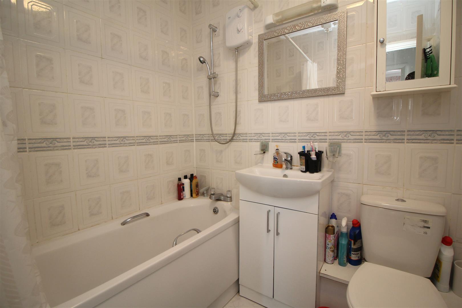 Bathroom - 1.85m x 1.60m (6'1" x 5'3") - Three-piece suite with a panelled bath with an electric shower over tiled splash backs wash hand basin with tiled splash backs, a low-level WC, wall mounted heater, and ceramic tiled flooring.