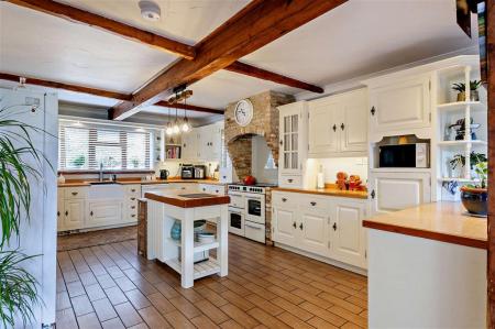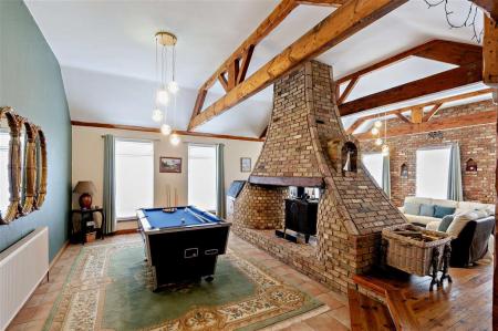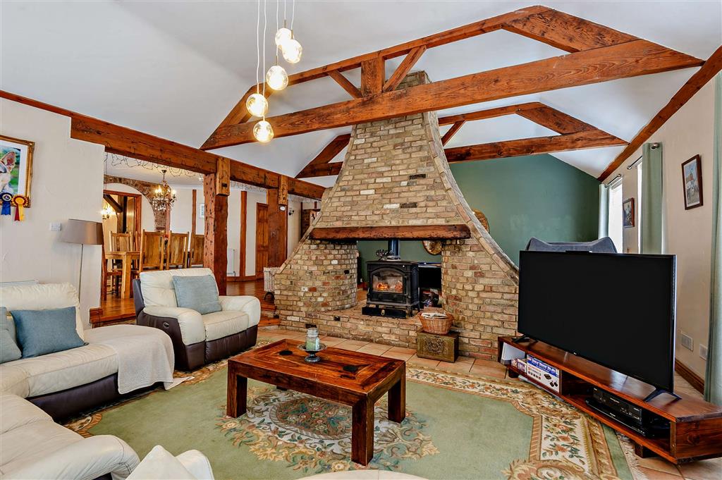 One of the standout features is the impressive split-level vaulted ceiling within the expansive family and dining room, complemented by one of the most striking and unique fireplaces you are likely to see in a domestic setting. The large country-style kitchen breakfast room further enhances the home, providing a warm and sociable hub for everyday living.