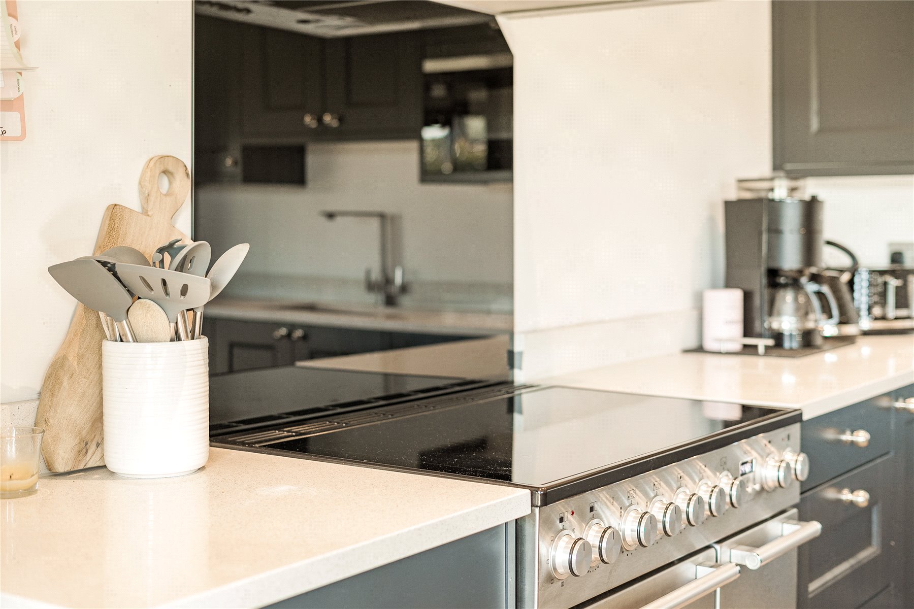 Step inside to be greeted by an impressive sense of space and contemporary style. The open-plan design creates an inviting atmosphere, ideal for entertaining or relaxing at home. The expansive reception room is thoughtfully divided into three distinct areas, each offering views of the beautiful garden. The dining area flows seamlessly into a sleek, well-equipped kitchen, featuring elegant granite countertops, ample wall and base units, a central island and wine fridge. Premium built-in appliances, including a Range Master oven/hob, microwave and dishwasher complete this culinary space.