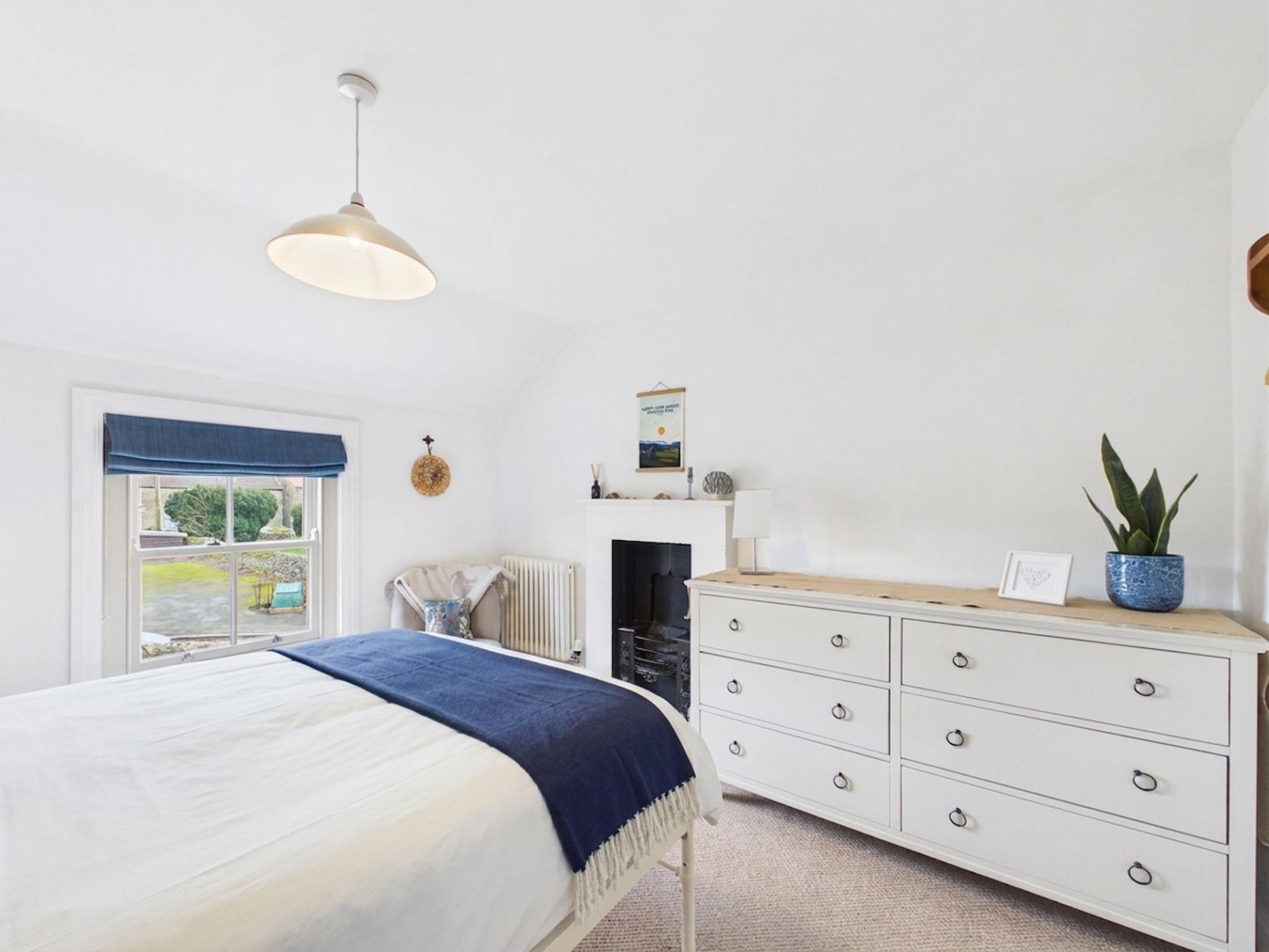 - Three Bedrooms: Two spacious doubles with cast iron fireplaces plus a versatile third room