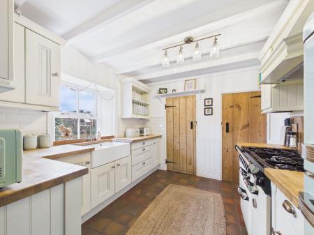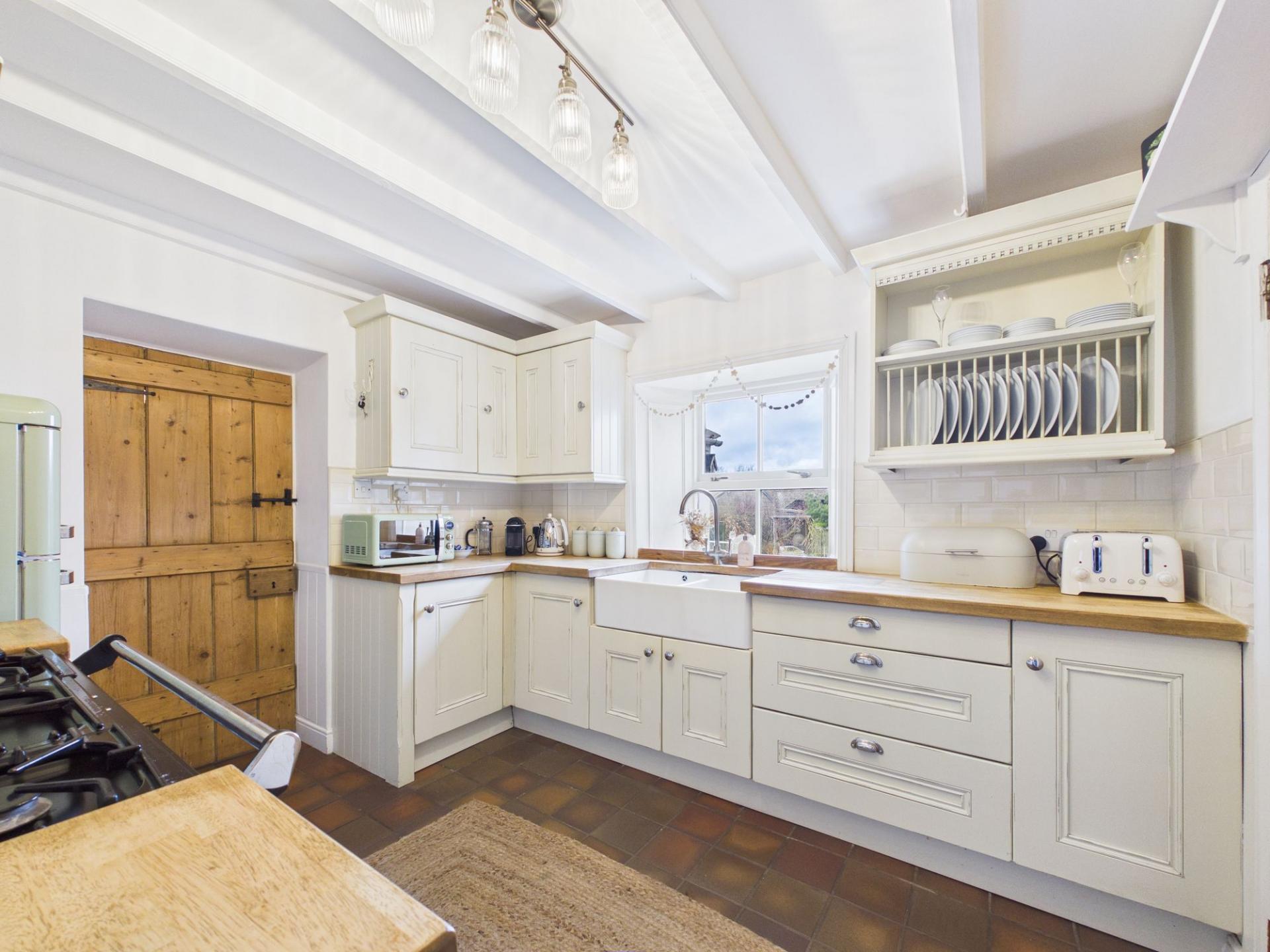 - Shaker Kitchen: Features solid oak worktops, a gas range, and a double Belfast sink