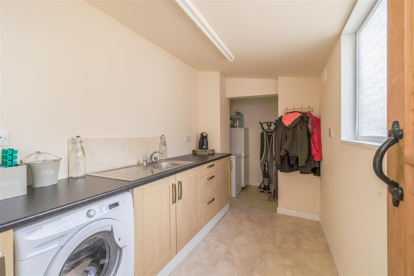 Outside utility space includes wooden window to side aspect, power points, lighting, fitted base units, roll top work surface, stainless steel 1.0 sink and drainer unit with tiled splash back, space for washing machine, tumble drier and fridge/freezer.