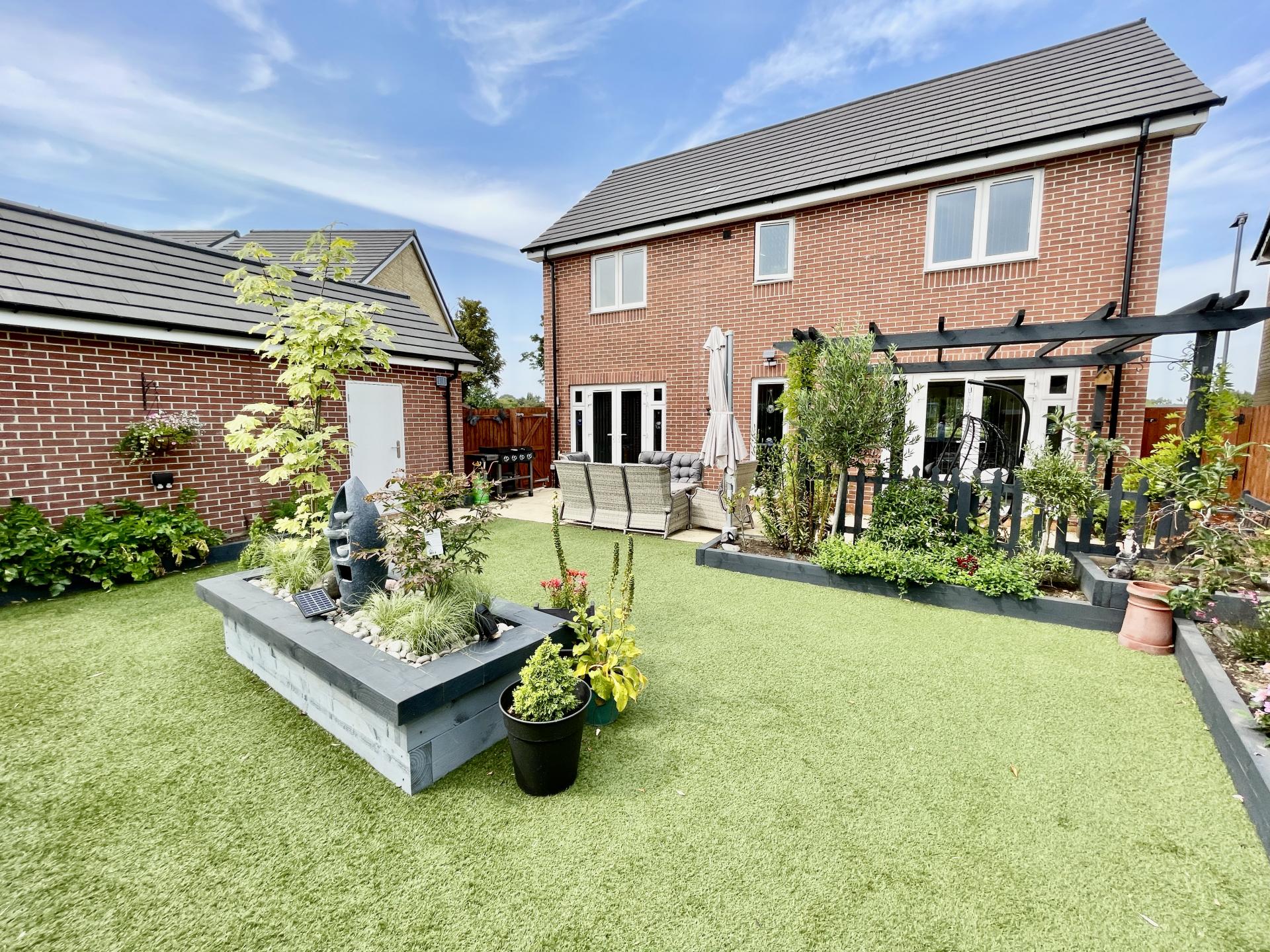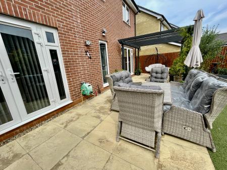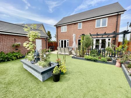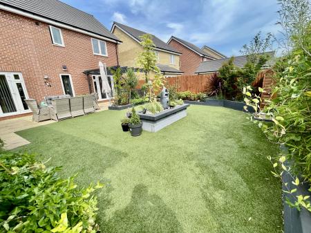 REAR GARDEN Low maintenance garden with flagstone patio area, external lighting, cold water tap, fenced boundaries to both sides and to the rear elevations, raised shrub borders and trees, Astro turf.