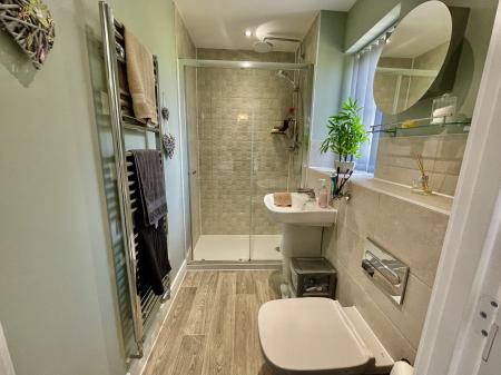 FAMILY BATHROOM 7' 4" x 6' 3" (2.24m x 1.91m) Obscured UPVC double glazed window to the rear elevation, part tiled walls, skimmed ceiling, inset LED lighting, extractor fan, fitted with a three piece suite comprising low level WC, wash hand basin with mixer tap, bath with mixer tap, shower screen and fitted thermostatic shower over.