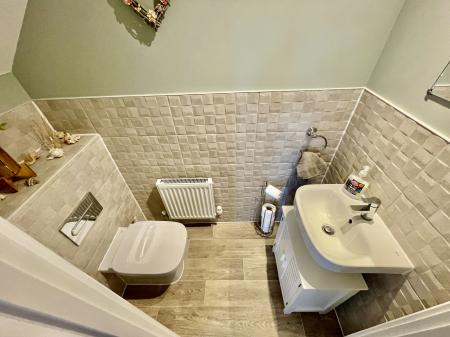 CLOAKROOM Skimmed ceiling, extractor fan, centre spotlight fitment, part tiled walls, vinyl floor covering, fitted with a two piece suite comprising low level WC and pedestal wash hand basin with mixer tap.