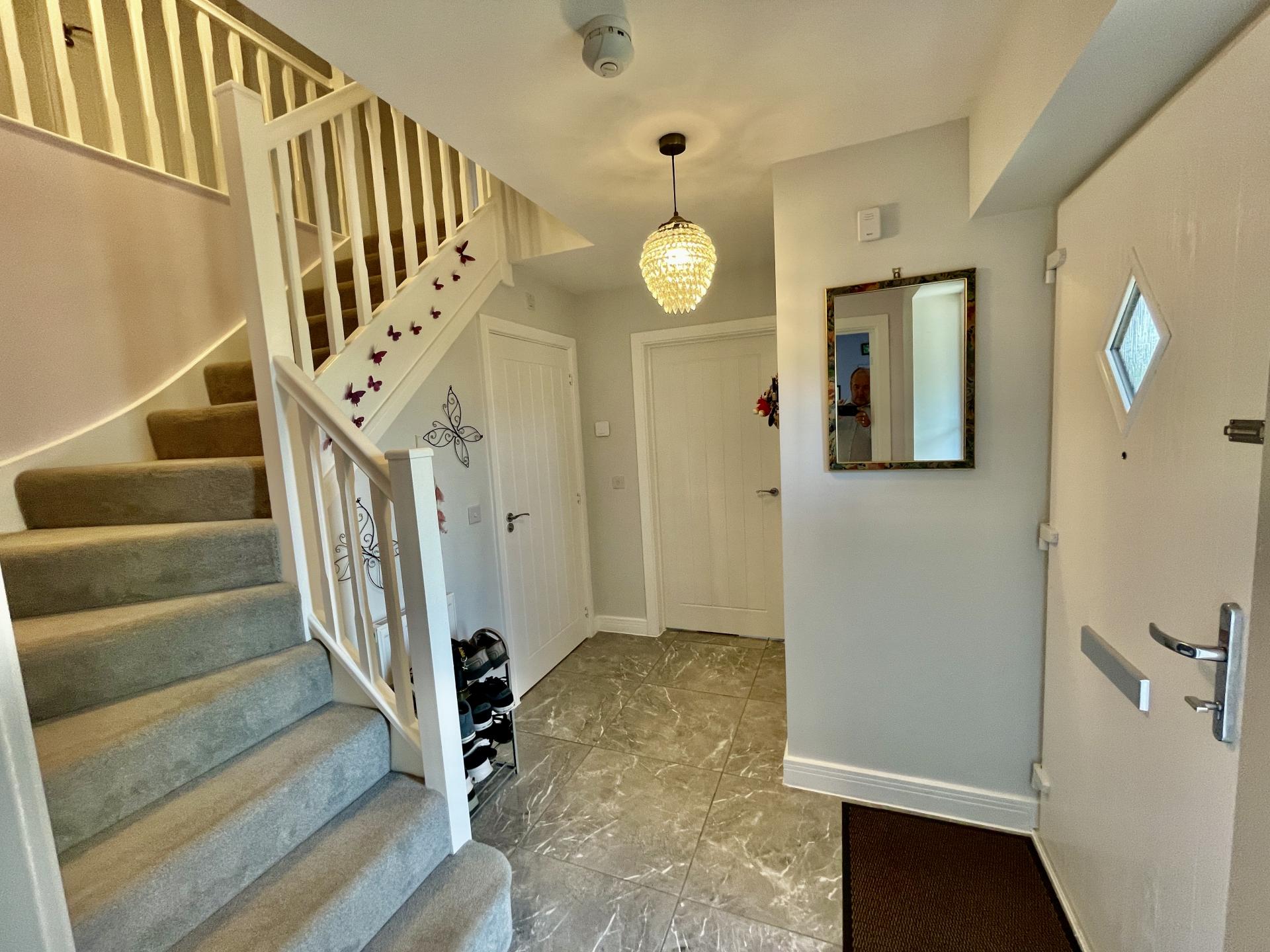 ENTRANCE HALLWAY Skimmed ceiling, centre light point, smoke alarm, staircase rising to the first floor, storage cupboard off housing electric consumer unit board, polished porcelain tiled flooring, door to: