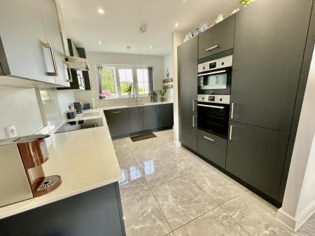 KITCHEN AREA 11' 10" x 8' 10" (3.63m x 2.70m) UPVC double glazed window to the front elevation, skimmed ceiling, inset LED lighting, porcelain polished tiled flooring, fitted with a wide range of base and eye level units, Quartz worktops, Quartz splashbacks, integrated Induction hob, electric stainless steel fan assisted oven, integrated stainless steel combination oven, integrated fridge freezer, integrated dishwasher, integrated washing machine, opening into: