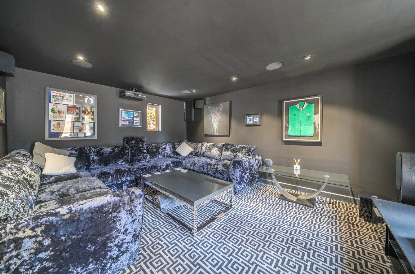 From the rear lobby, a further door opens into the fully equipped high specification Dolby Atmos Cinema Room with 122" Remote Retractable Screen a spacious, fully soundproofed room currently used for media, but equally suitable as a games room, gym or additional ground floor bedroom, with blackout blinds fitted to the windows at both front and rear.