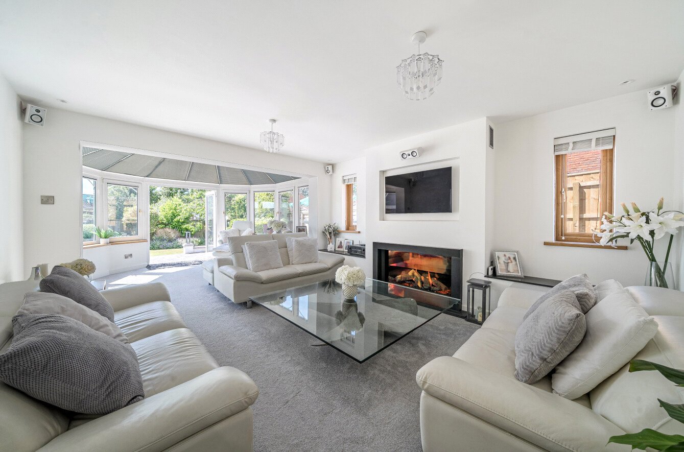 The sitting room is a generous, comfortable reception space, featuring a contemporary gas fire with ambient lighting and built-in shelving. The room opens directly into a conservatory, offering additional living space and lovely views over the garden.