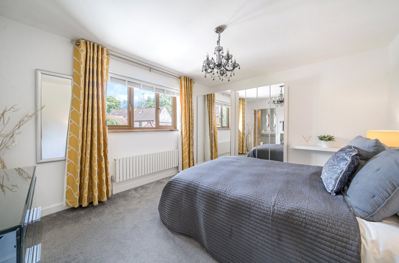 There are three further generously sized double bedrooms. Bedroom two overlooks the front, while bedroom three benefits from a dual aspect. Bedroom four is an ideal guest suite with views over the rear garden and its own high-end en suite featuring a walk-in shower, basin with storage, WC, and premium tiled finishes.