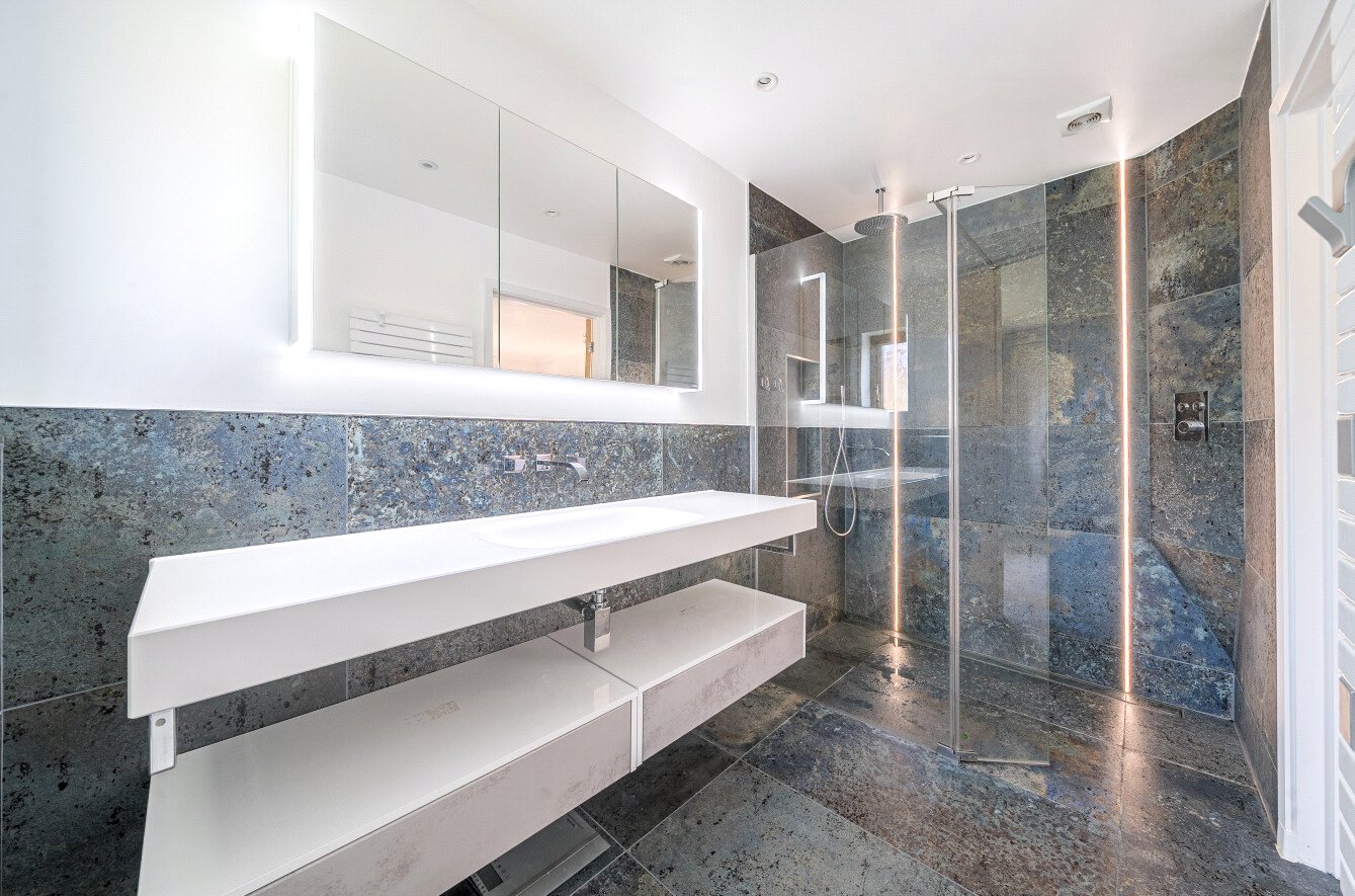 The principal bedroom is a light-filled, dual-aspect double room with a comprehensive range of fitted furniture including wardrobes, dressing table, and drawers. Its luxurious en suite boasts a walk-in shower with recessed shelving and automatic lighting, a sleek wall-mounted basin with storage, WC, and stylish tiling with a heated towel rail.