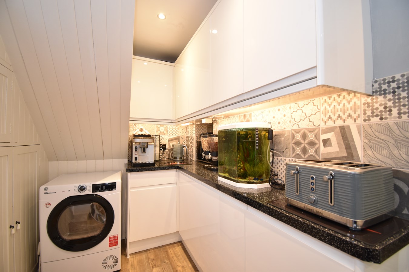 14' 8" narrowing to 7' 1" x 10' 0" (2.16m x 3.05m) Double glazed window to rear. Double glazed door to side access. Fitted kitchen to include base and wall units. Electric oven and hob with extractor over. Integrated fridge/freezer. Integrated dishwasher & washing machine. Space for tumble dryer. Small cupboard. Feature vertical radiator. Vinyl plank flooring. Recess lighting.
