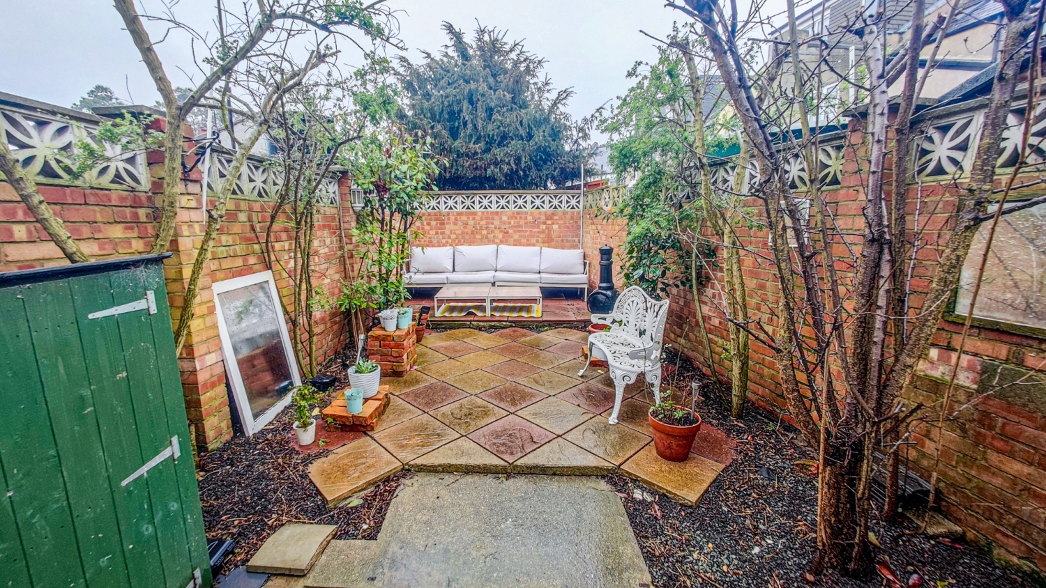 Outside, the rear garden is designed for easy maintenance, featuring a paved area ideal for outdoor seating, a section of artificial grass at the rear, and perennial shrubs bordering the walled garden, creating a lovely green and floral backdrop in the warmer months.