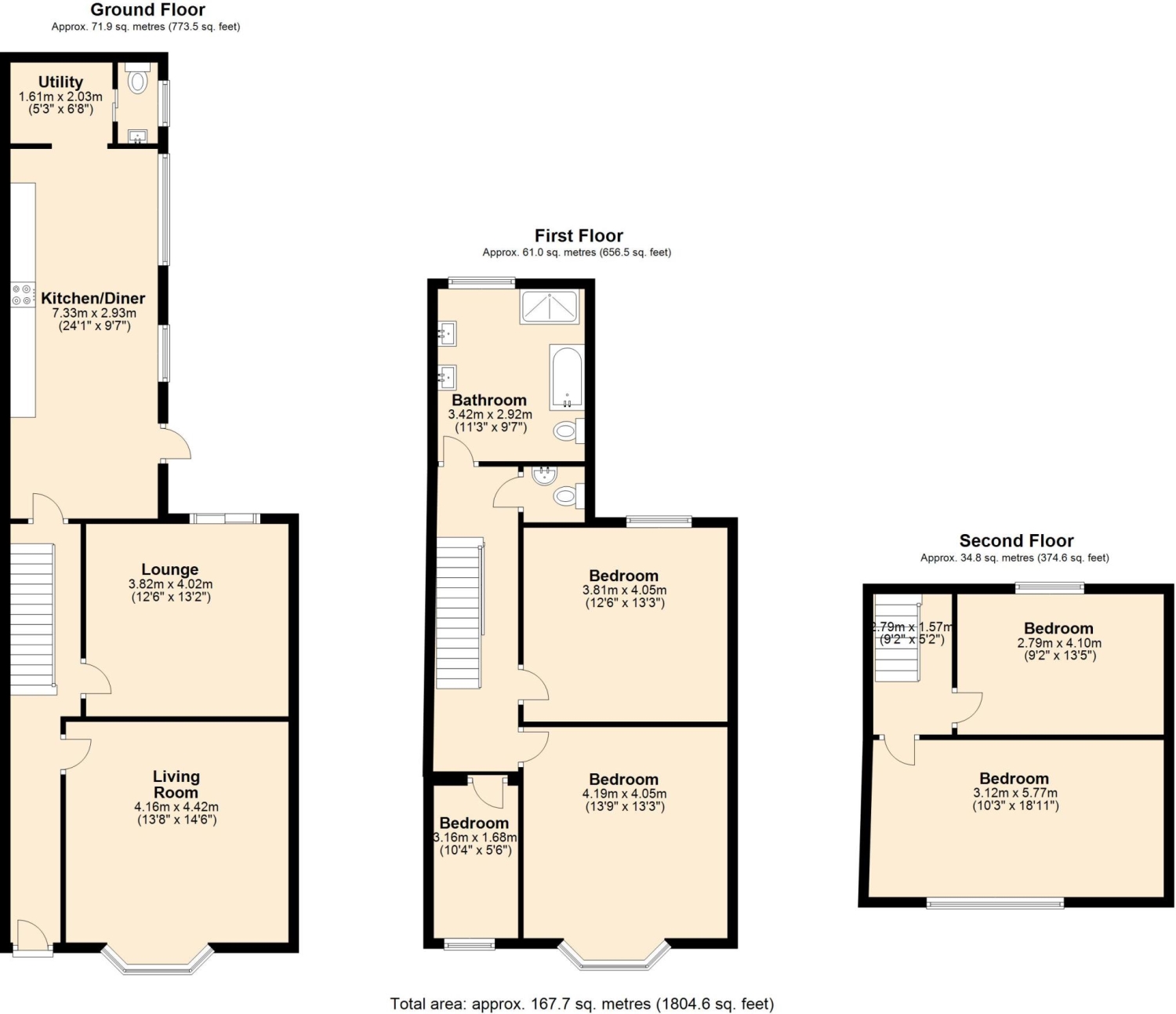 Upstairs on the first floor, the accommodation includes three well-proportioned bedrooms, a spacious family bathroom and a separate WC. The principal bedroom at the front boasts another bay window, flooding the room with natural light. The top floor offers two additional double bedrooms, ideal for children, guests, or flexible use such as a home office or creative space.
