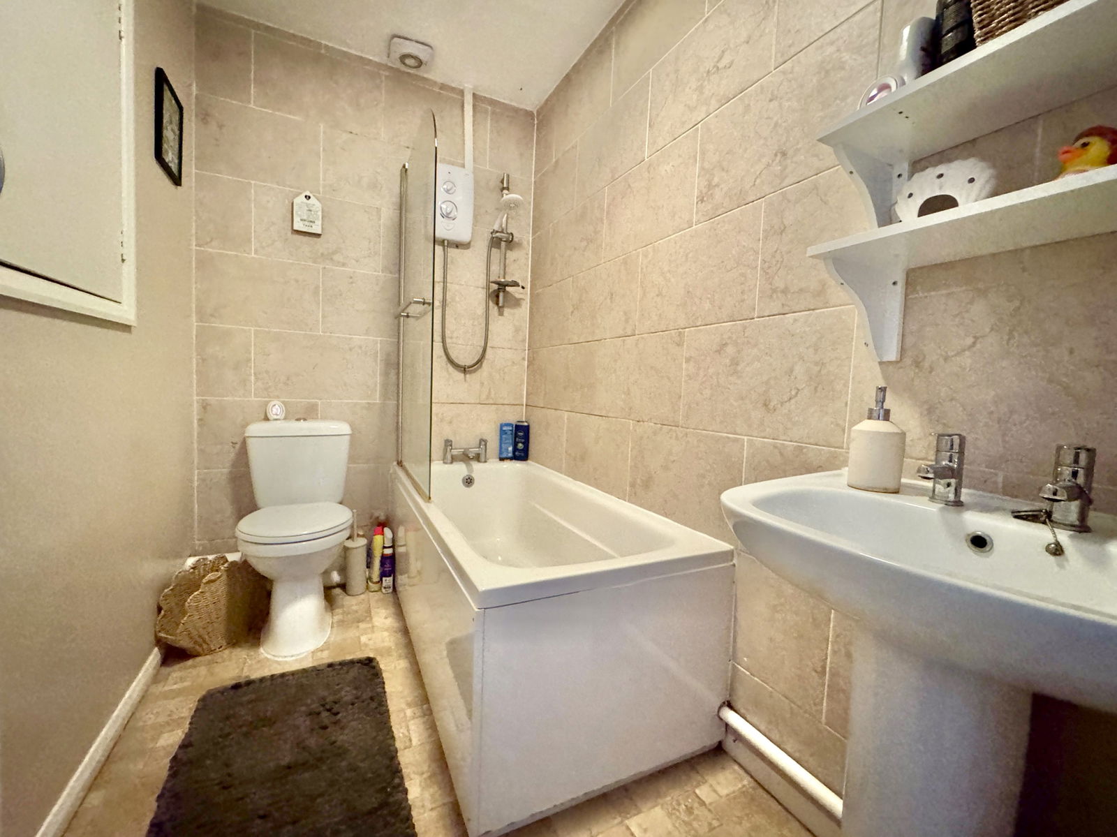 Matching suite comprising a panelled bath with electric shower over, low level WC, pedestal wash hand basin, part tiled walls, extractor fan, heated towel rail, and built in storage cupboard.