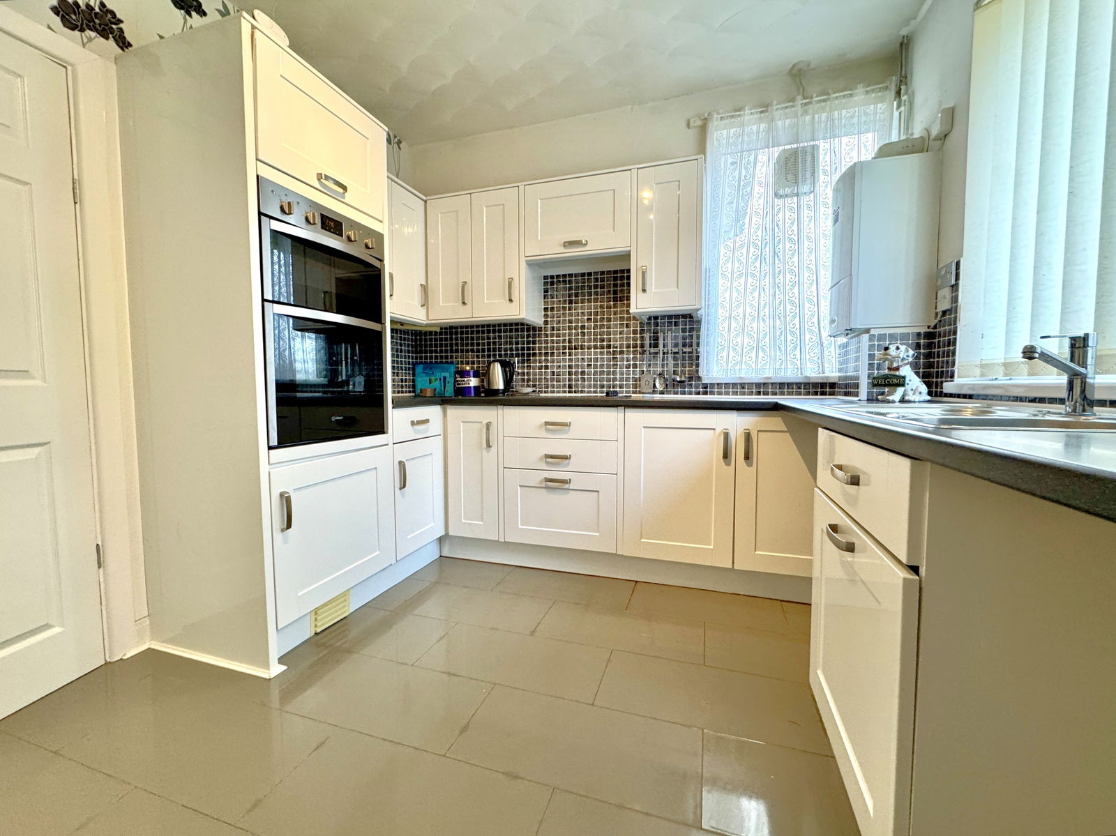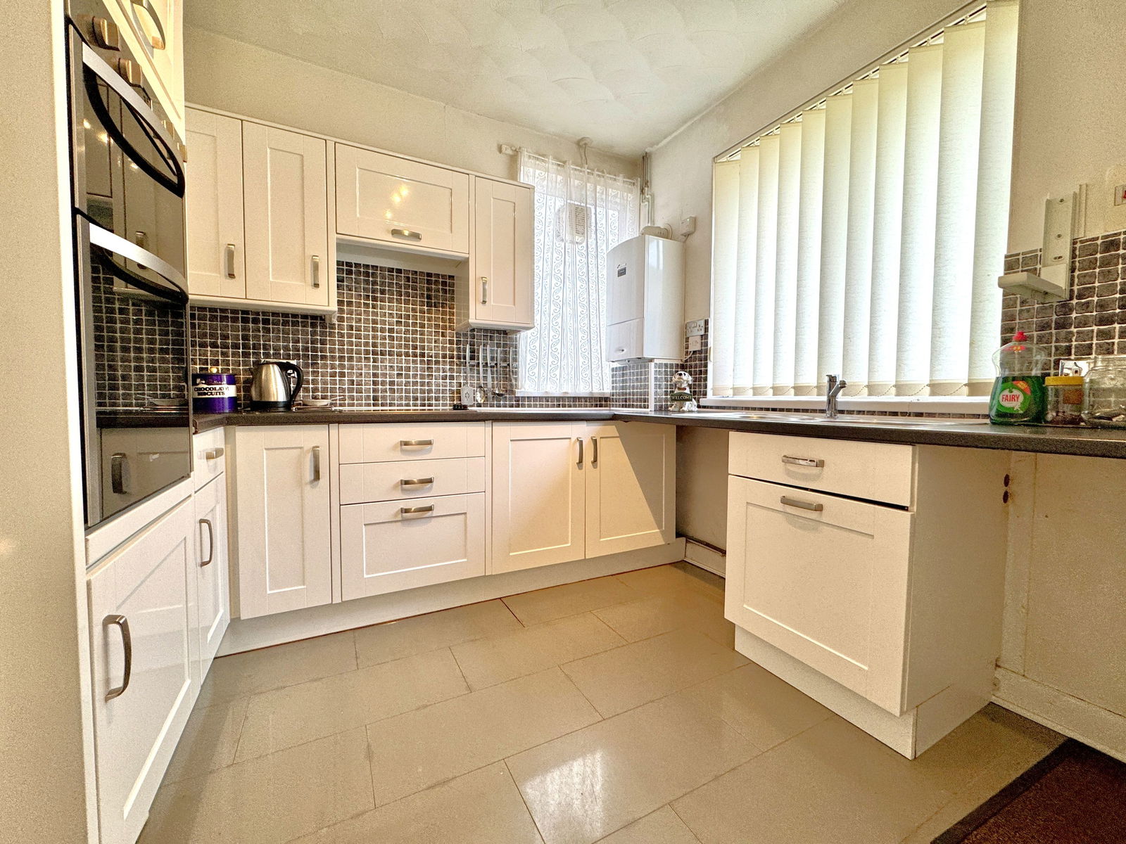 Roll-edge work surfaces with white gloss cupboards and matching wall units, single drainer sink unit with mixer tap, built-in electric oven and four-ring hob with extractor hood over, built-in fridge/freezer, plumbing for a washing machine, wall-mounted gas boiler serving domestic hot water and the central heating system, tiled splashbacks, and PVCu double glazed windows to the front and side.