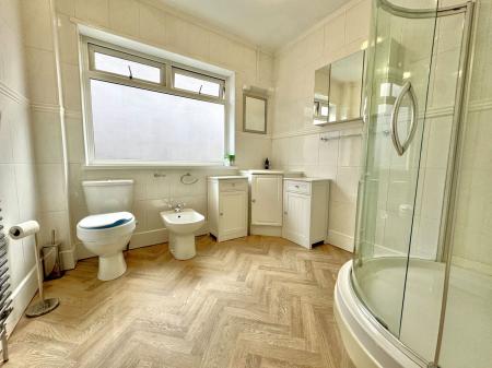 Matching suite comprising a tiled shower cubicle with inset shower, low-level WC, bidet, wash hand basin with storage under, fully tiled walls, heated towel rail, and PVCu double glazed frosted window to the rear.