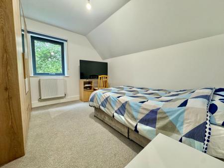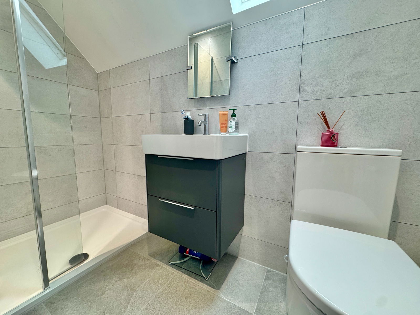Comprising a tiled shower cubicle, low-level WC, wash hand basin with storage beneath, fully tiled walls, extractor fan, heated towel rail, and Velux window to the rear.