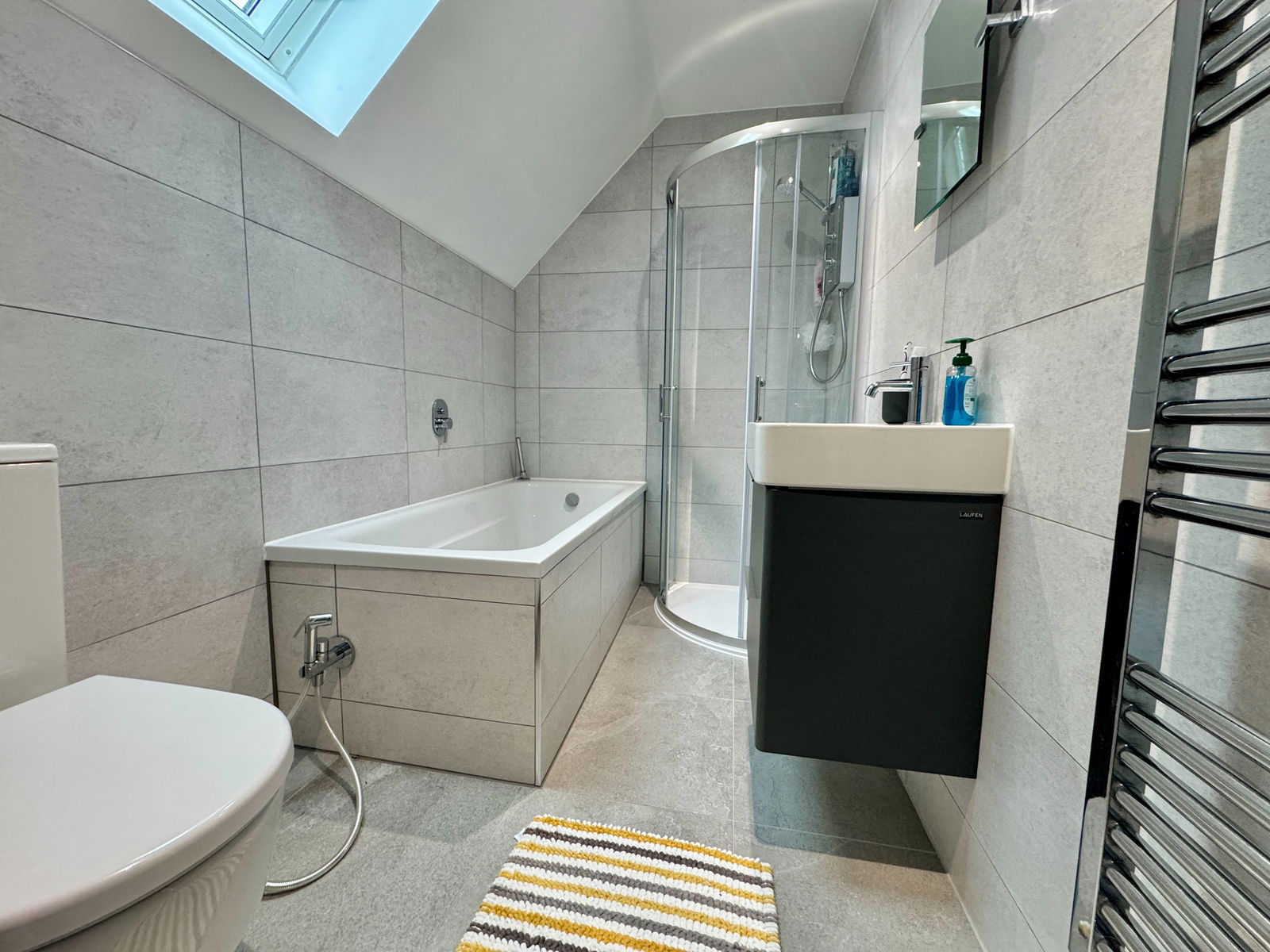 Matching suite comprising a panelled bath with detachable shower attachment, low-level WC, wash hand basin with storage cupboard, heated towel rail, and Velux window.