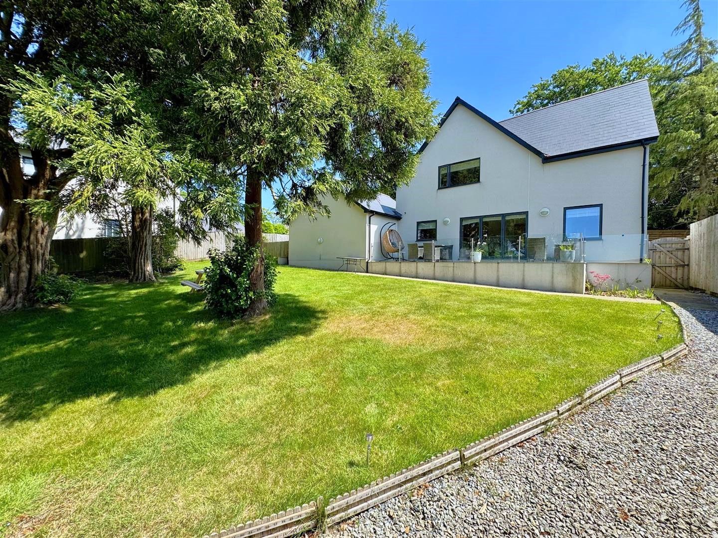 The property stands on a generous, well-maintained south-westerly facing plot. To the front, there is a herringbone driveway providing parking for two cars, leading to a double garage with an electric car charging point. Lawned gardens to the side and a pathway leading to the enclosed rear garden.