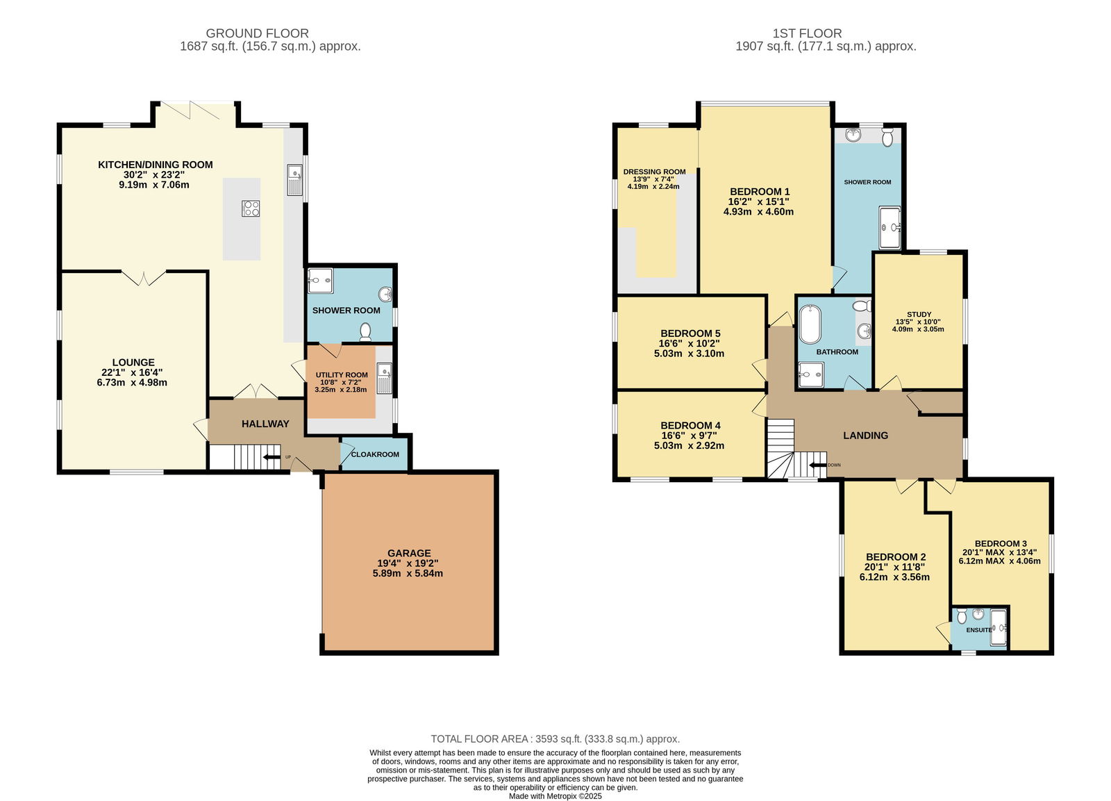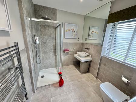 The master bedroom is a fantastic room with a Juliet balcony with sliding patio doors, oak flooring, and inset spotlights. A separate dressing room offers a full range of fitted wardrobes, shelving, and hanging space, and enjoys a dual aspect. The en suite shower room is fitted with an oversized shower cubicle and drencher head, low-level WC, pedestal wash hand basin with storage beneath, a chrome towel rail, and full-height tiling to all walls and the floor. Bedroom two is a further double room with a window to the side elevation, oak flooring, and its own en suite shower room, which includes an oversized shower cubicle, wash hand basin, WC, and tiled walls and floor. Bedroom three, also a double, has a window to the side elevation and fitted Sharps wardrobes. Bedroom four is a double-aspect room with windows to the front and side elevations and oak flooring. Bedroom five is another good-sized double with oak flooring and a window to the side elevation.