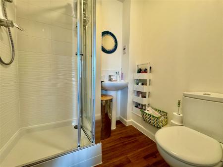 Tiled shower cubicle with inset shower, low level WC, pedestal wash hand basin, heated towel rail, shaver socket and extractor fan.