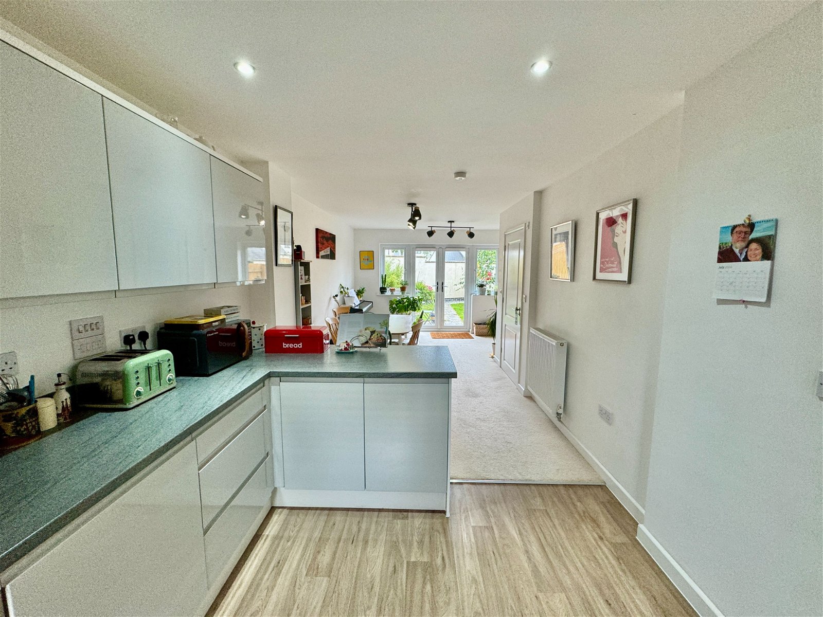 Roll edge worksurfaces with grey gloss cupboards and drawers under and matching wall units, single drainer with mixer tap, built in electric oven and four ring gas hob with extractor hood over, plumbing for washing machine and dishwasher, two radiators, cupboard housing the gas boiler which serves domestic hot water and central heating, PVCu double glazed French doors to the rear garden, door to: