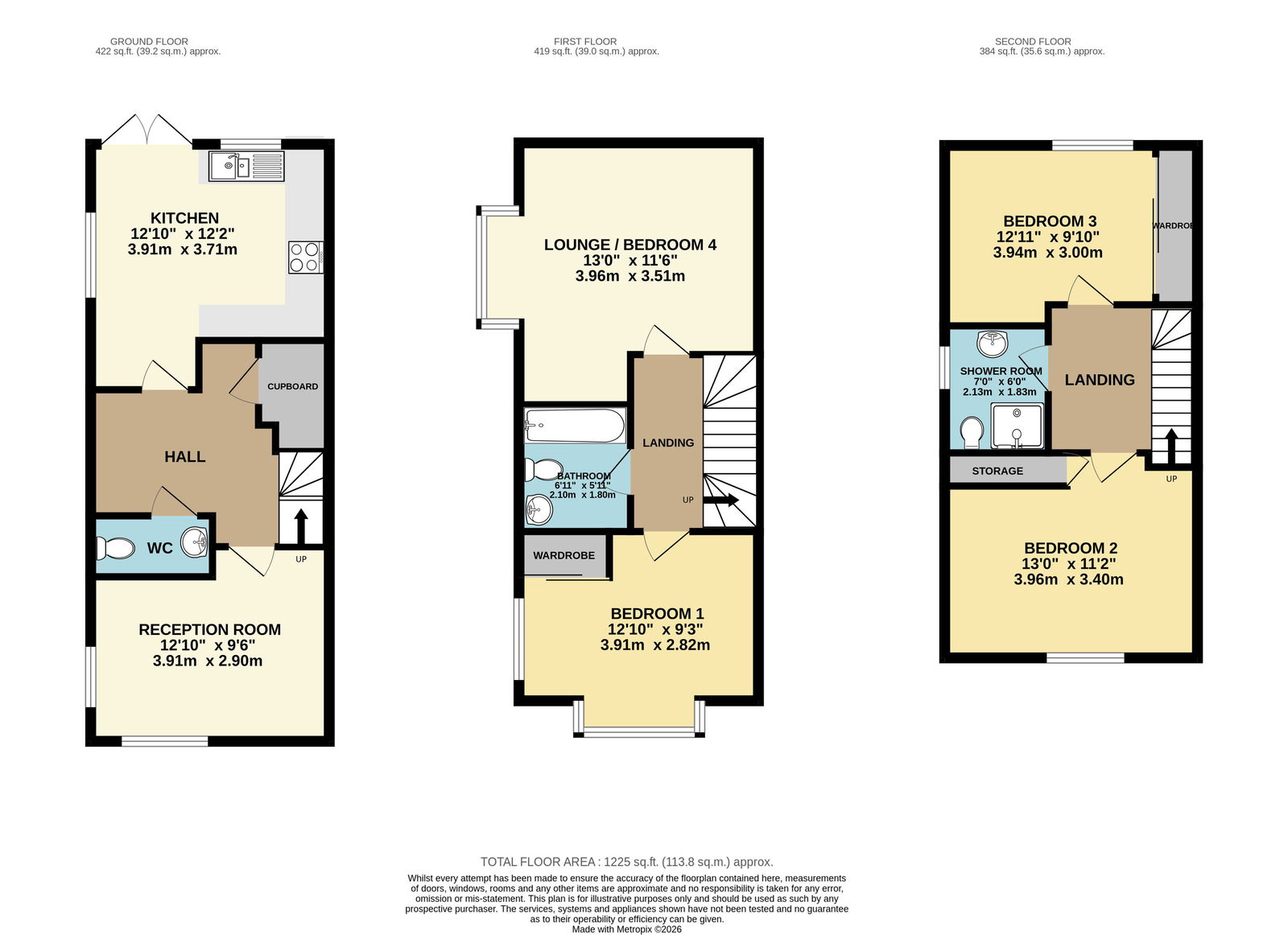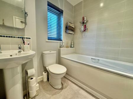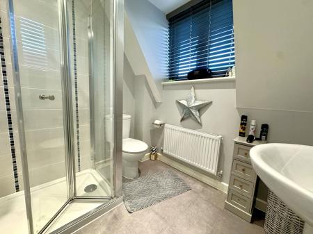 Comprising tiled shower cubicle with inset shower, low level W.C, pedestal wash hand basin, extractor fan, PVCu double glazed frosted window.