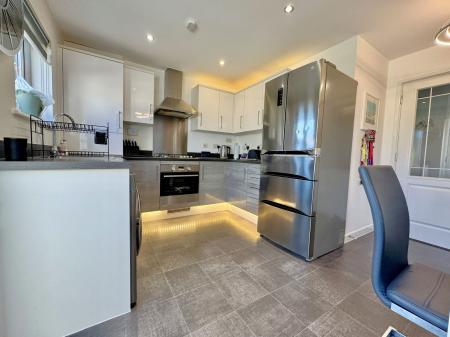 Roll edged worksurfaces with cupboards and drawers under and matching wall units, single drainer sink unit and mixer tap, built in electric oven and four ring gas hob with extractor hood over, plumbing for washing machine, cupboard housing gas boiler which serves domestic hot water and central heating system, PVCu double glazed window to front, PVCu double glazed window and French doors to rear.