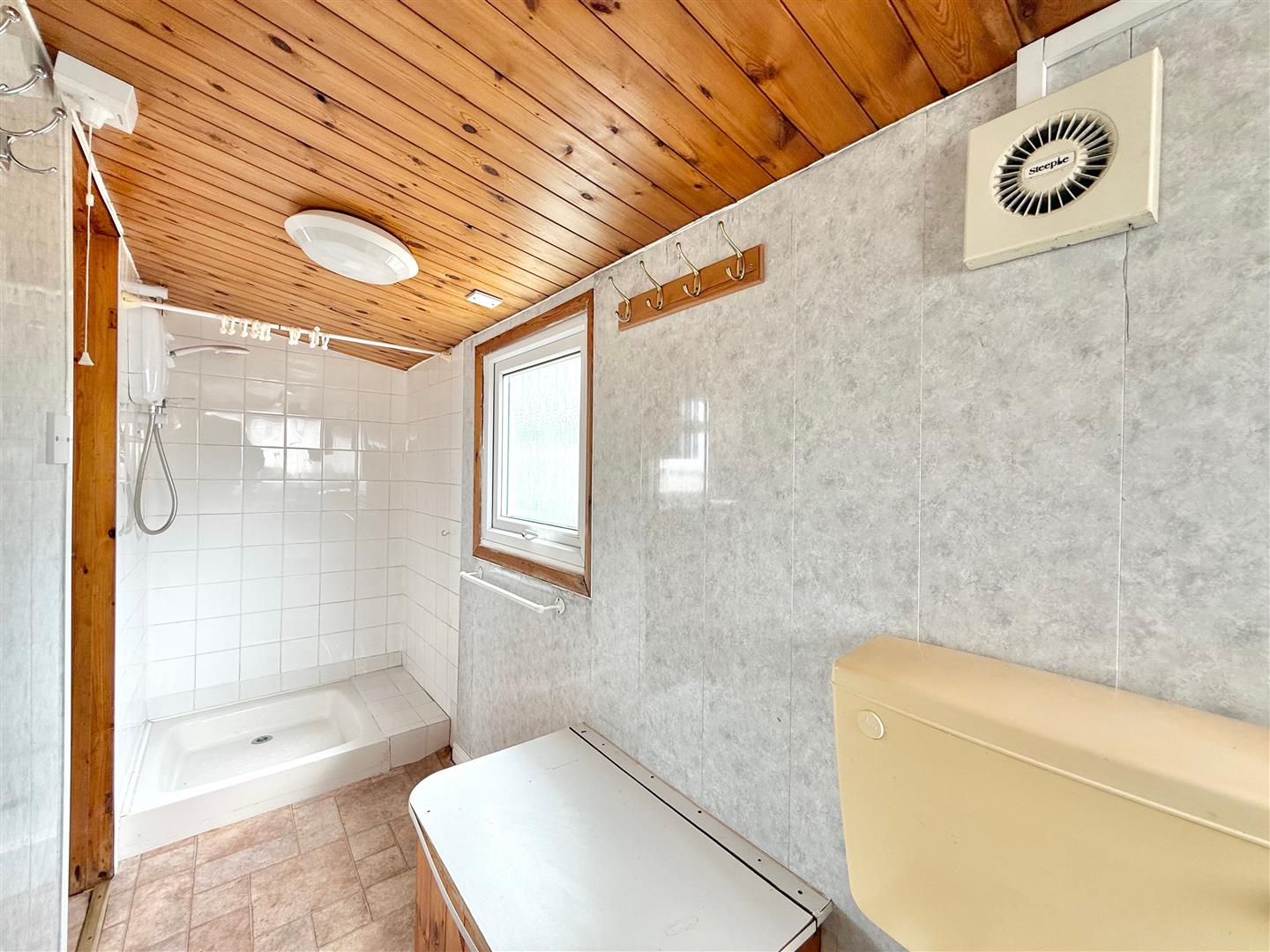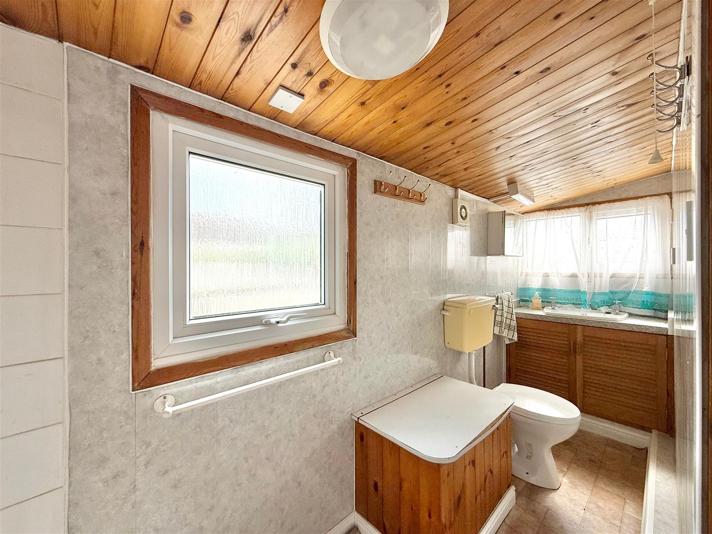 Bathroom - 4.01m x 0.97m (13'2 x 3'2) - Tiled shower with shower system, rail and curtain, wc and wash handbasin. Dual aspect with uPVC double-glazed windows to the rear and side elevations. Storage cupboard. Medicine cabinet. Waterproof panelling to the walls.