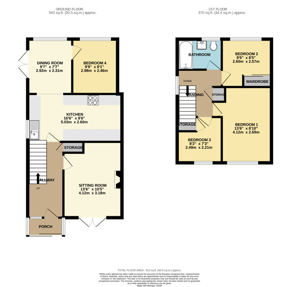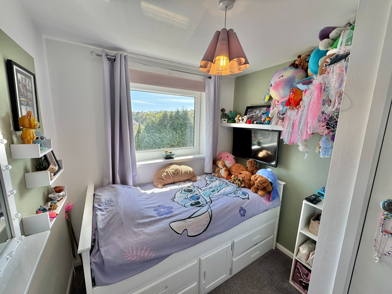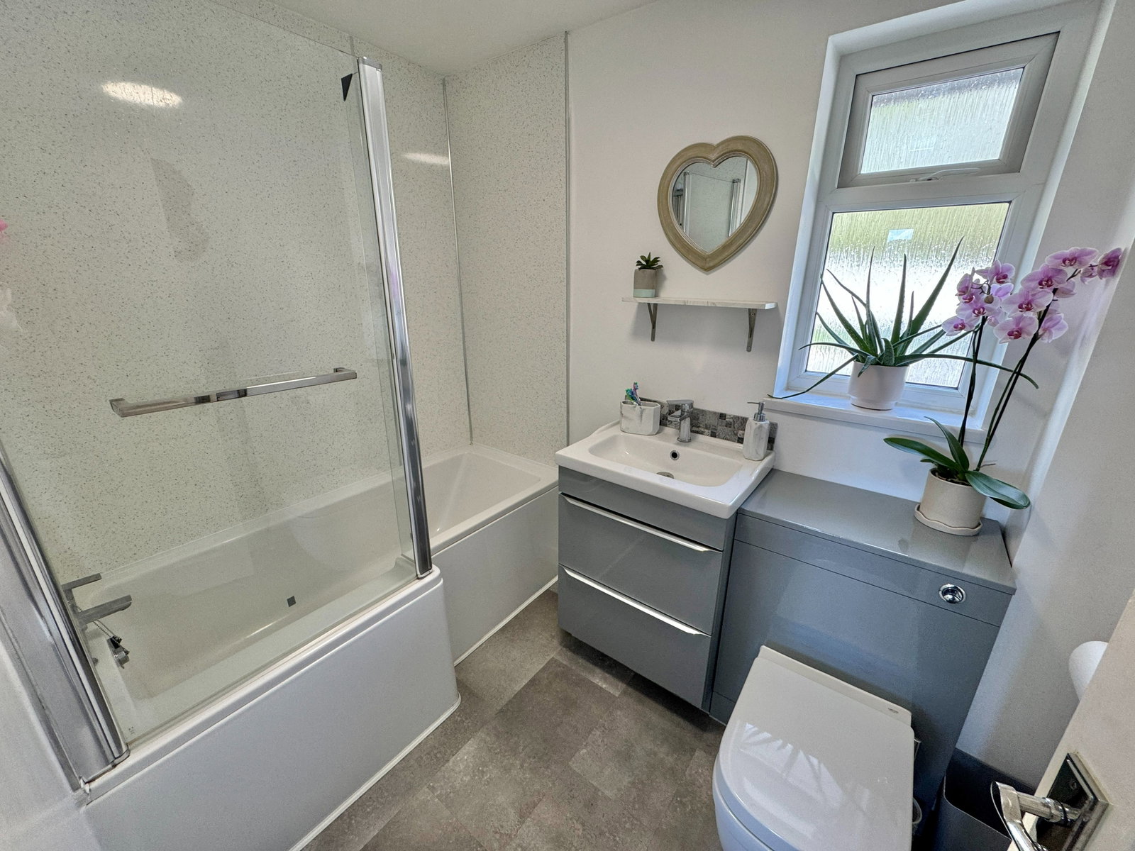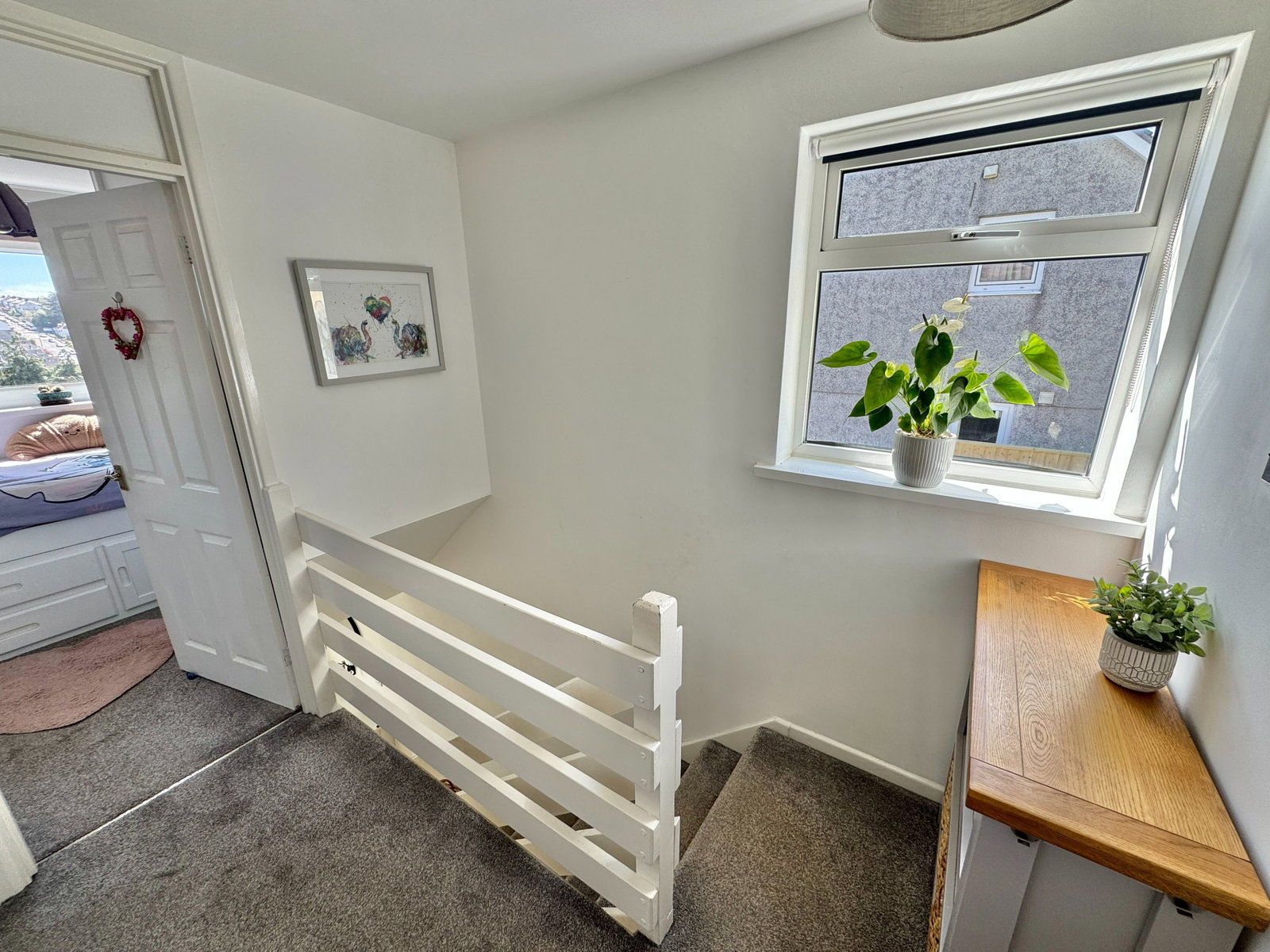 From the main hallway, carpeted stairs ascend to the first floor landing with a window to the side elevation, pull down loft access with a ladder leading to a boarded loft, and a large built in storage cupboard. Bedroom one, a spacious double has window to the front elevation with far reaching views. Bedroom two, a further double has a window to the rear and fitted wardrobes with sliding mirror doors. Bedroom three, a good single has a window to the front with further fitted wardrobe. The family bathroom is fitted to a high standard with a matching white three piece suite comprising; a panel enclosed bath with easy clean splash backs and a glass screen with a Triton shower over, extractor fan, low level WC, pedestal wash and basin with storage and drawers, chrome towel rail, tile effect flooring and a window to the rear elevation.