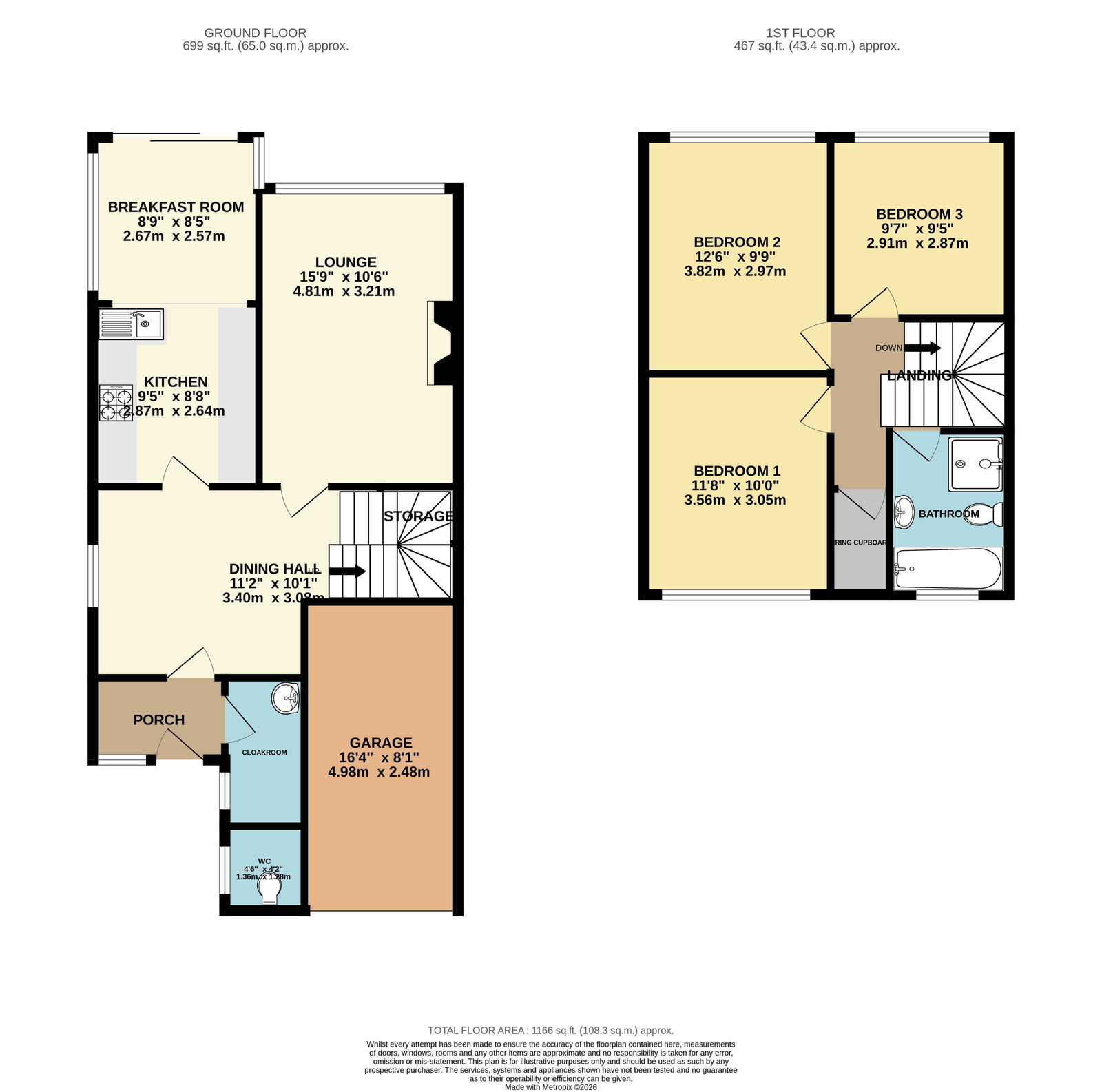 The family bathroom is fitted with a low-level WC, pedestal wash hand basin, panel-enclosed bath, tiled shower cubicle with an electric shower, a window to the front elevation, and an airing cupboard housing a wall-mounted Worcester combination boiler.
