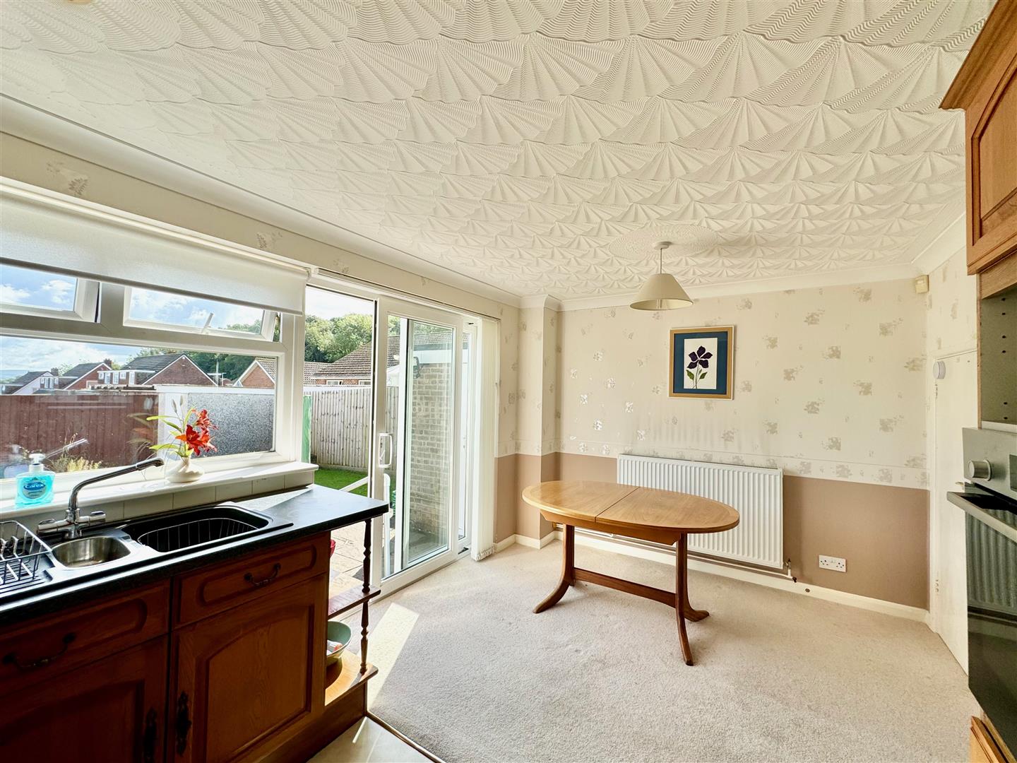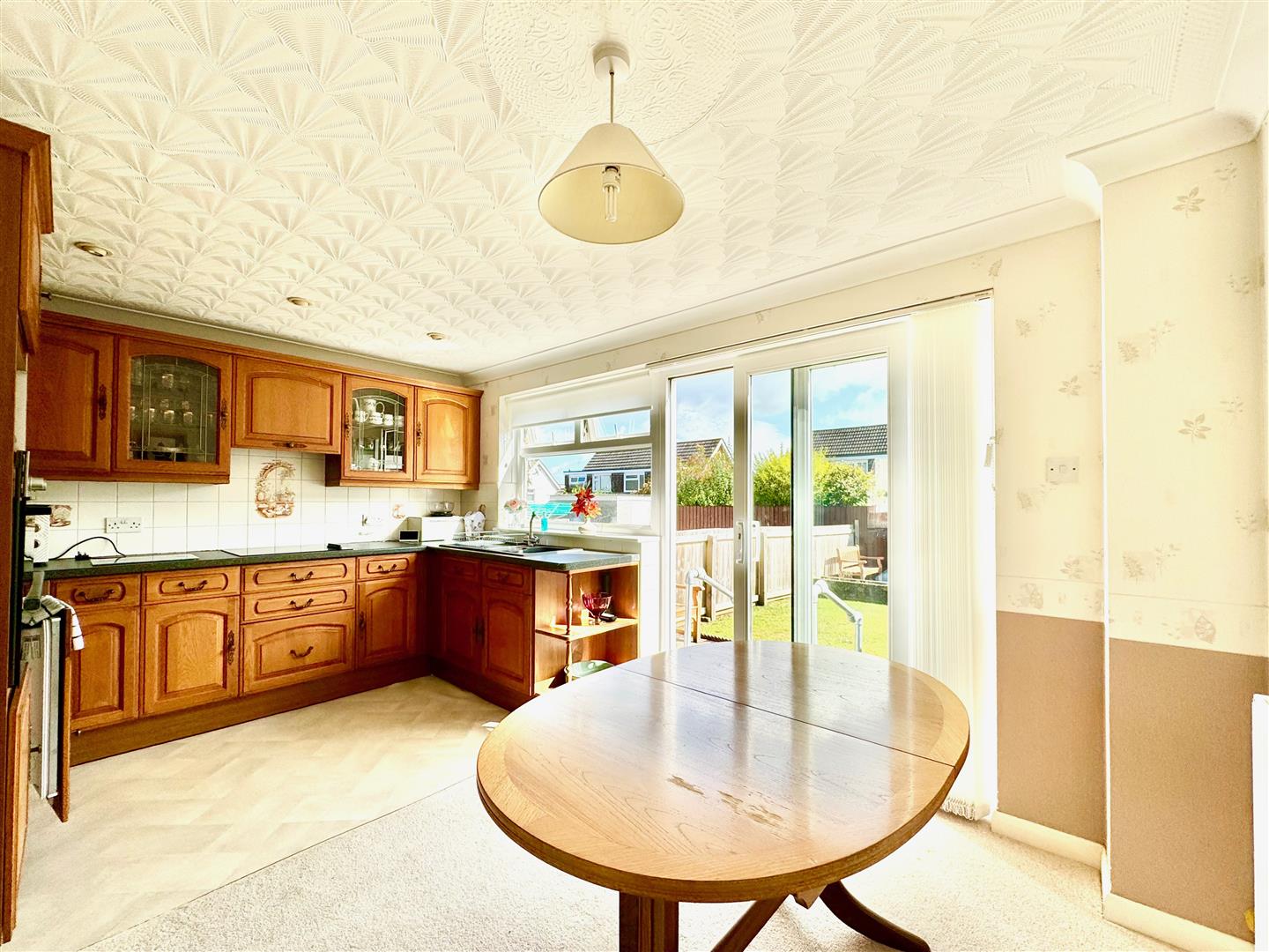 Kitchen/Dining Room - 4.45m x 2.90m (14'7 x 9'6) - Running the full-width of the property. Providing ample space for dining table and chairs. Under-stairs storage cupboard. Base and wall-mounted kitchen cabinets with matching fascias, work surfaces and tiled splash-backs. Inset one-&-a-half bowl sink unit. Built-in Bosch oven. Inset hob with cooker hood above. Integral fridge. Window to the rear elevation with views over the garden towards Dartmoor. Sliding double-glazed doors with fitted blinds, also providing views and opening onto the garden.