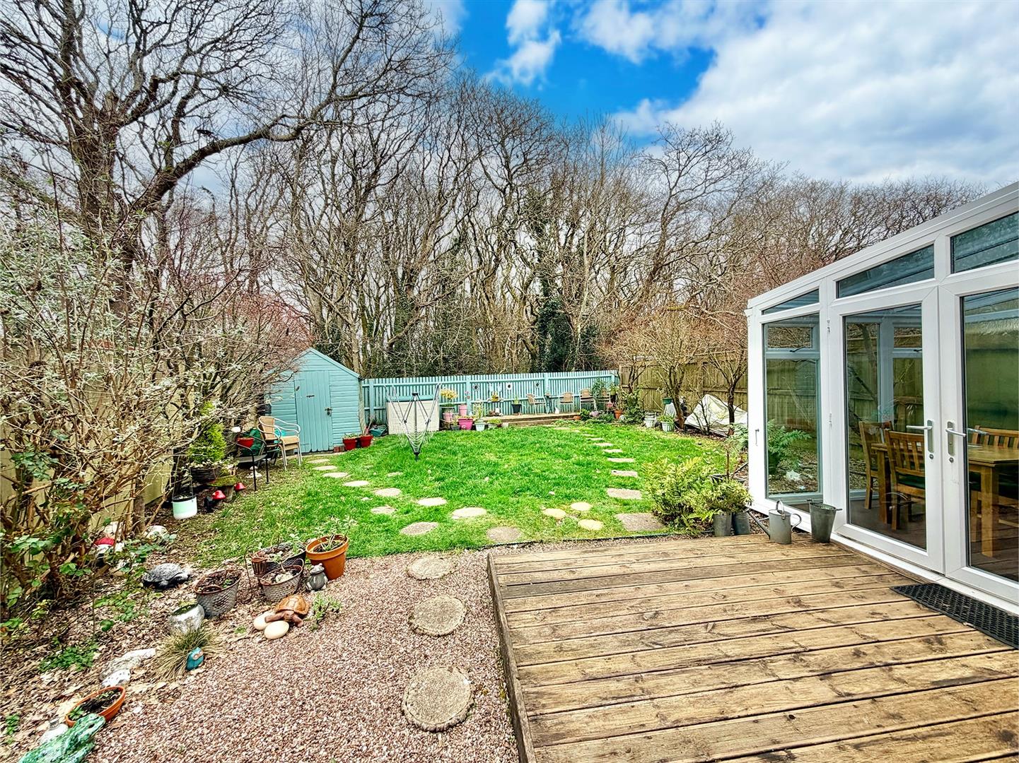 Outside - To the front, the garden is laid lawn with bordering shrub and flower beds. A driveway runs alongside the property, providing off-road parking. A timber gateway provides access around the side of the house to the rear garden. The rear garden has areas laid to lawn, chippings, paving and decking together with mature planting. The garden backs onto woodland and has a timber shed and an outside tap.